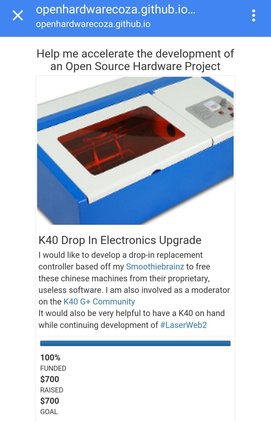100% funded!!! K40 community I thank you a million!!! +Peter van der Walt has a special thank-you for all those that donated planned. You guys are awesome I can’t wait to see the things he does with this machine from both the software and a hardware side of it