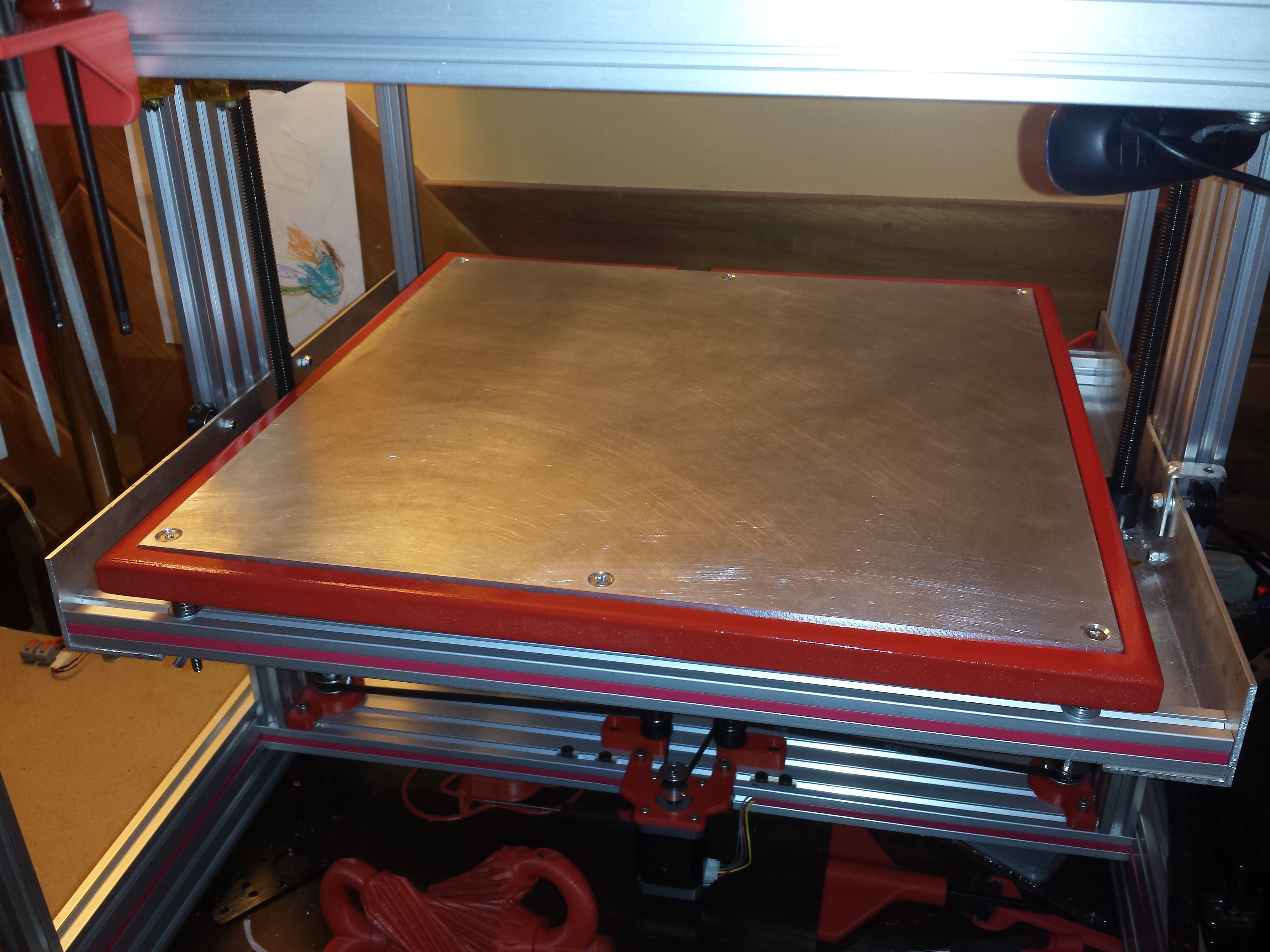 And so a well-fitted plate would overcome those. Warm ABS vs hardwood? I like the idea of a plate that I can take out - put all the connectors on a plug. Makes it easy to clean, easy to maintain. I have a 230mm x 300mm 6mm aluminium plate as my spreader - it weighs about a kilo. Add in the heater and glass and it would take a heck of a nozzle catch to knock it out of its bed. I have a CNC router, I will be making a custom-fitted hardwood platform.
