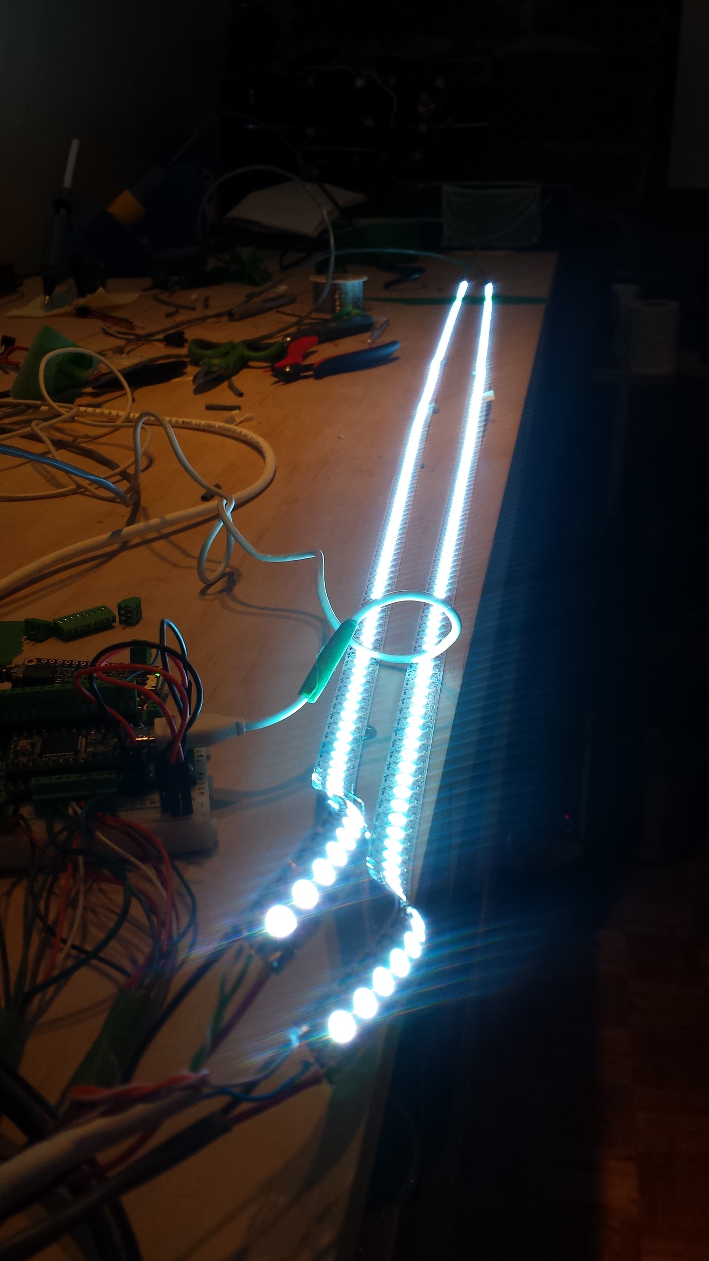 I have these two strips of 172 WS2812B which will be required to run at full white for extended periods of time. Power is coming in at both ends with the V rail cut mid-way.