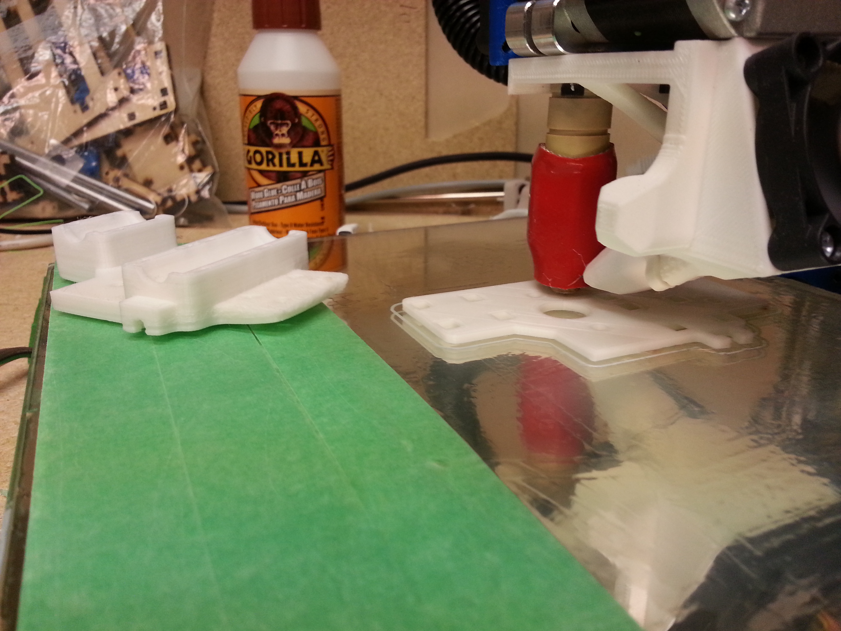 1st attempt at a critical piece pulled the tape off the glass. In desperation, I’m trying gorilla glue. Spread a modest layer with a blade and quick dried with a heat gun. Started print while (unheated) bed was still warm. No shrinking/curling so far.