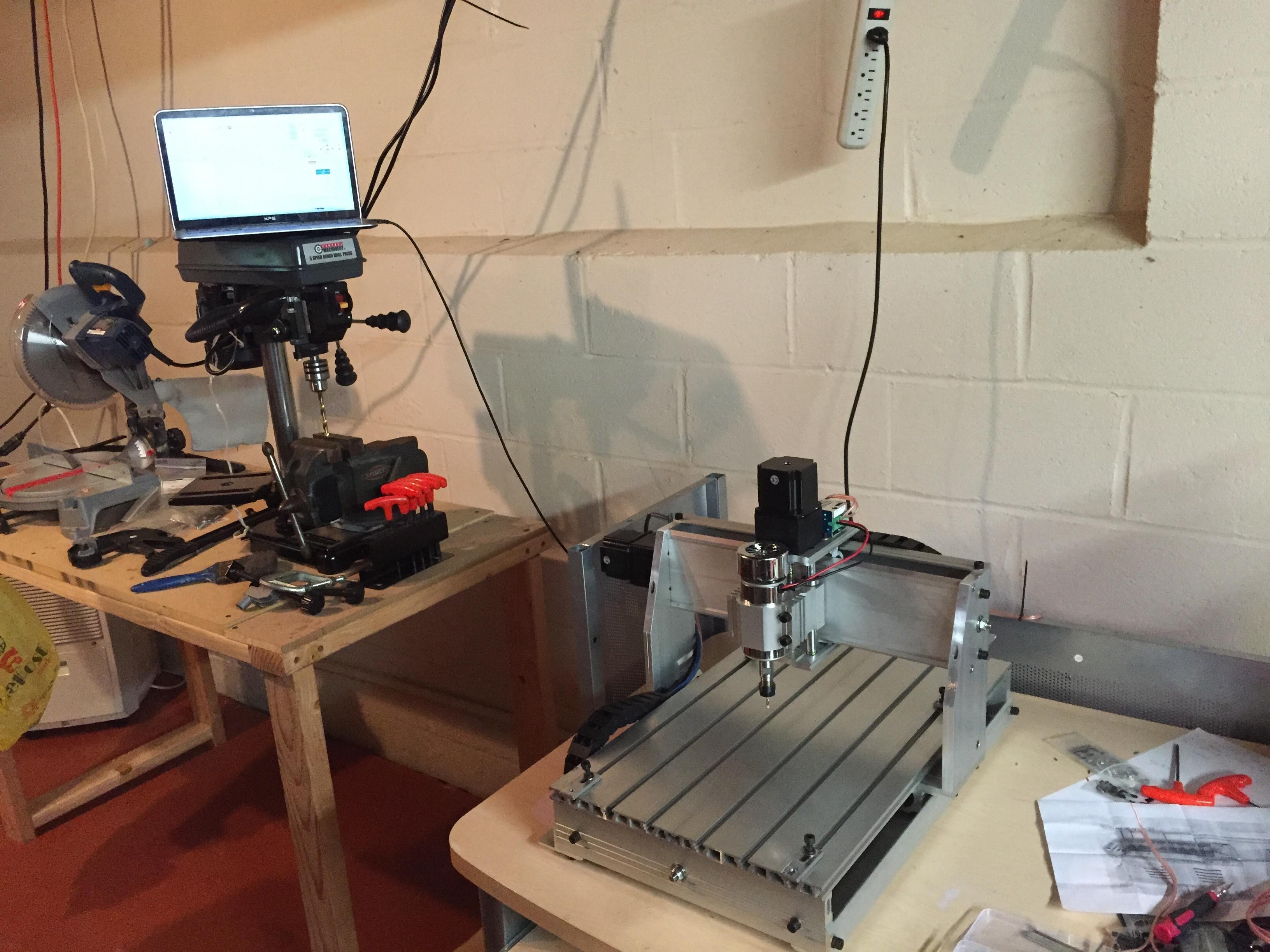 3040 in its new home. Mounted the PSU and TinyG (thanks @Riley_Porter_ril3y ) on the verticals of this desk. Jogs successfully. Obviously the laptop perched on the drill press is not a feasible solution - I will install a Pi but I do not trust the wifi connectivity in this area. No endstops or PWM control of the spindle yet (manual controller with potentiometer), have touch plate but have not hooked it up yet.