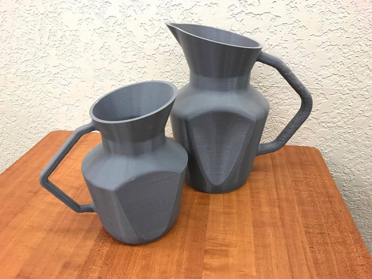 3d Pitcher Set, larger one stands 12 inches tall, and they hold liquids. Printed on Series 1 Type A , gray PLA
