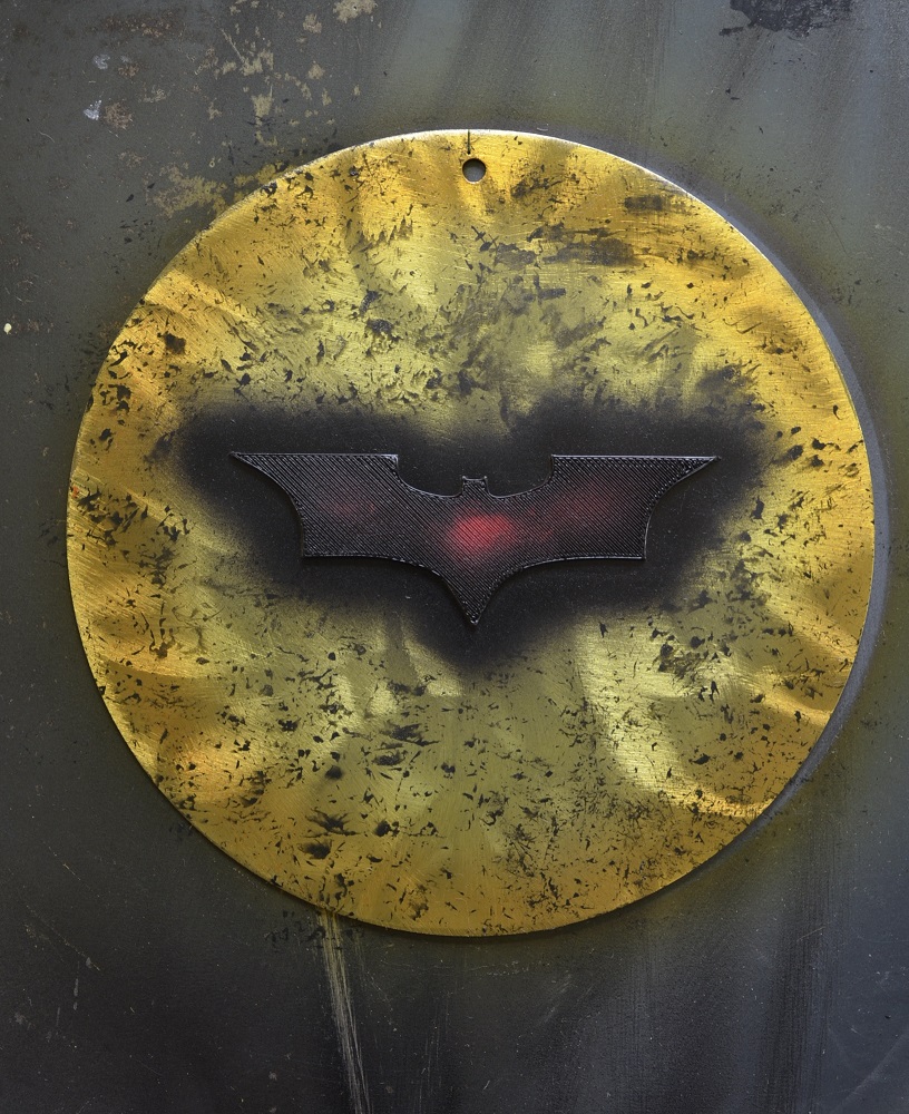 3D printed Batman logo used as a template (airbrush). The final logo has 3D effect depending on the angle of the light.