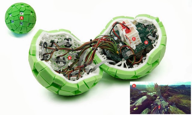 The sphere, about the size of a softball, is protected by blocks of foam. Thirty-six cell-phone camera modules, each with a resolution of two megapixels, are set into the surface. Each module stores its portion of the mosaic until it is transferred to the ball’s microcontroller.