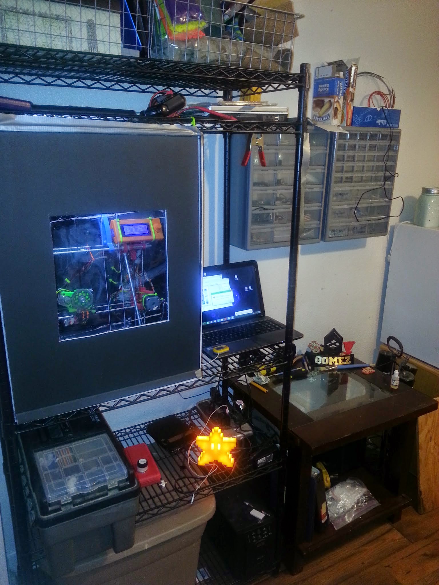 $6 Heated Chamber and my new work space for my Prusa v2. Moved everything into my dining room so that I don’t have to hide in the other room. Of course it also makes me keep it clean since it’s the second thing you see after walking into my house. And yes that is a Pixel Tree Topper Star made by Knape on Thingiverse http://www.thingiverse.com/thing:194864.