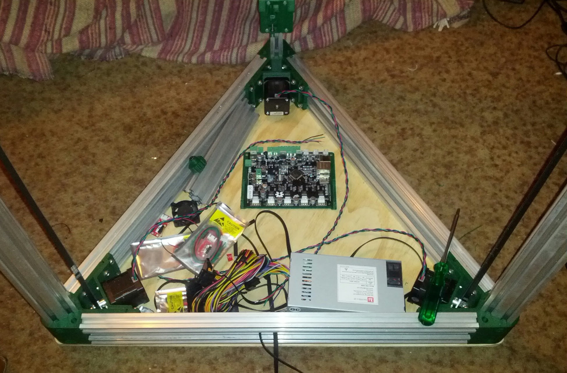 A 5C smoothie board sitting small and alone in the base of @Ngarewyrd_Shurasae 's fairly large delta printer… The 400 step motors hemming it in on three sides and an e3d volcano soon to be lurking far overhead waiting in readiness for spool upon spool of thermoplastics…