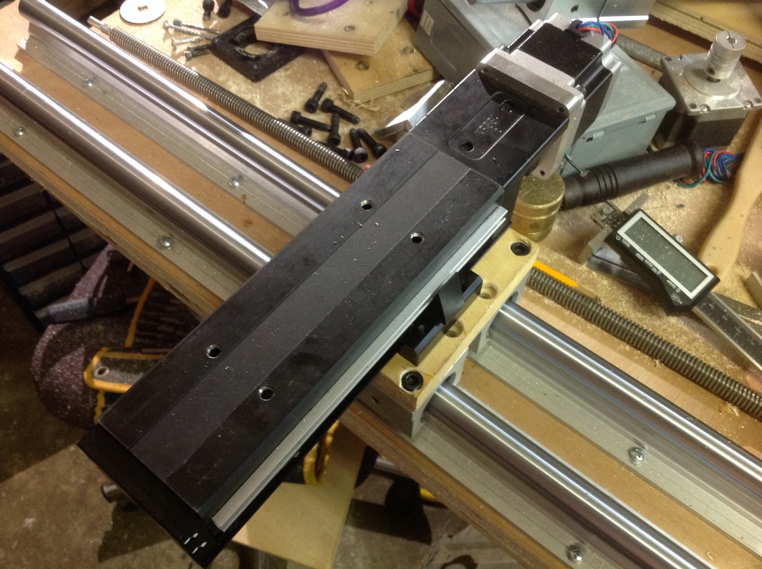 A bit of progress on a side project. 36 x 24 CNC router. The z-axis is temporary until I get something built. Bed is 1/2 in. Ply torsion box with 20mm supported rail on sides. Gantry is going to be a box structure but only face of it is ready. Debating 1/2-10 acme screws or direct drive with #25 chain. I have the screws to fit already but would prefer direct drive. Might need to upgrade the wimpy 1n/m NEMA 23 steppers for direct drive. I am just going to stick a laminate trimmer on it for now. I figure the other projects would do better if I both got this mess off the work table and got started using it to make other parts.