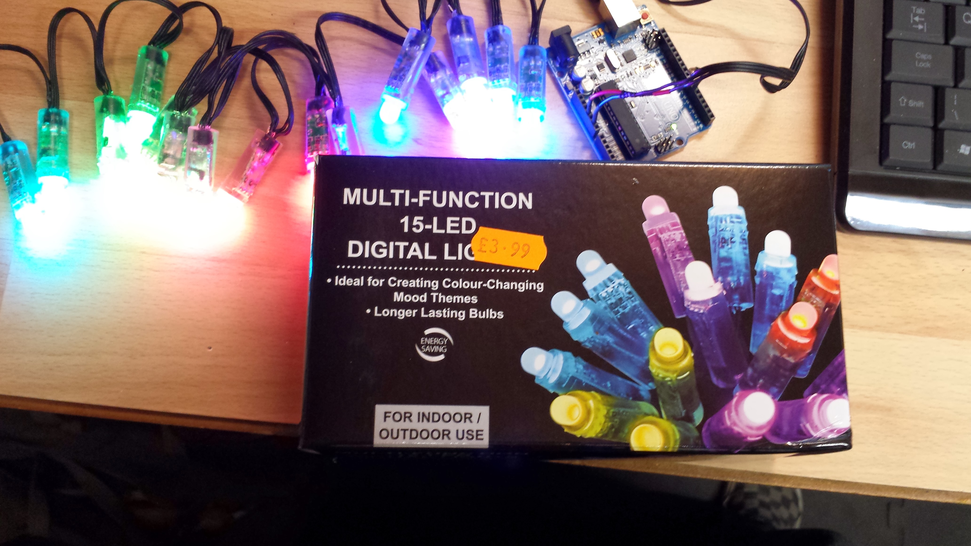 A couple of people have asked me for more details on the cheap pixel strings I picked up this weekend, here’s a picture of the box, the importer is in Essex, UK. I should think that the price I got them for was a clearance special though.