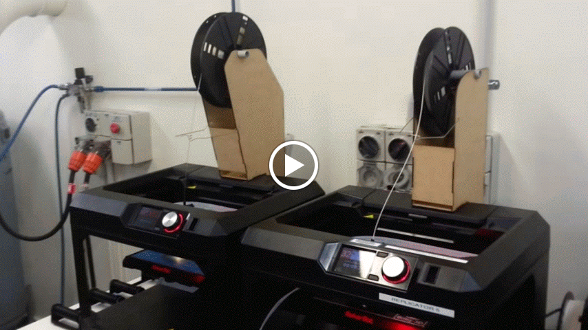 A couple of prototypes of a quick fix for our Makerbot Fifth Gens. The new spool holder design appears to deliver better prints and less extruder jams.