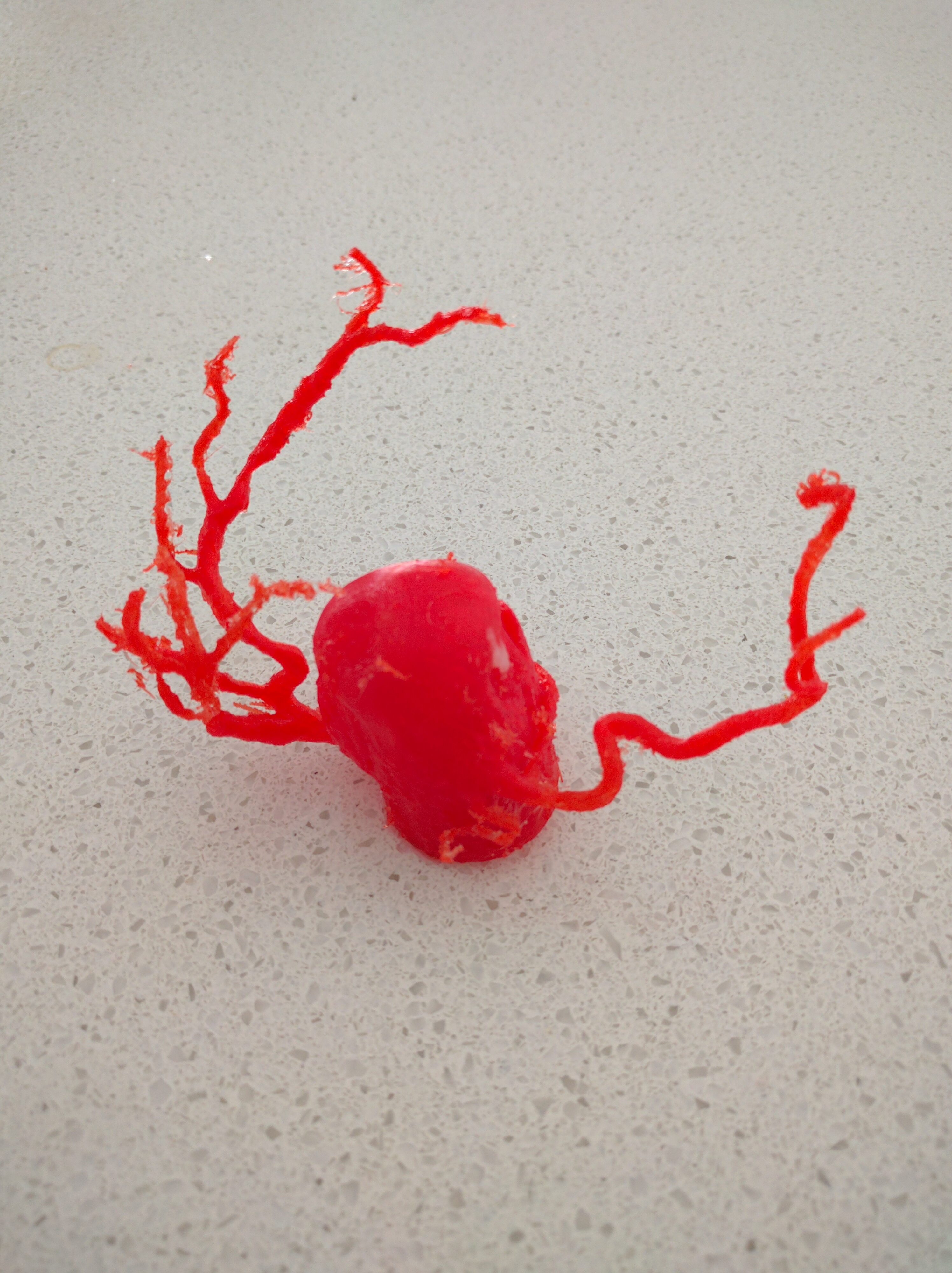 I then got some PVA filament to use as the support material, but it isn’t the best material to work with, with a lot of stringing, which got into the printed model, and supports that were incomplete - don’t even mention the wall - so it was only after a few attempts, at different print orientations that I managed to get this out. For those who don’t know, an entire artery (the left anterior descending) is missing from the model but the other two came out okay.
