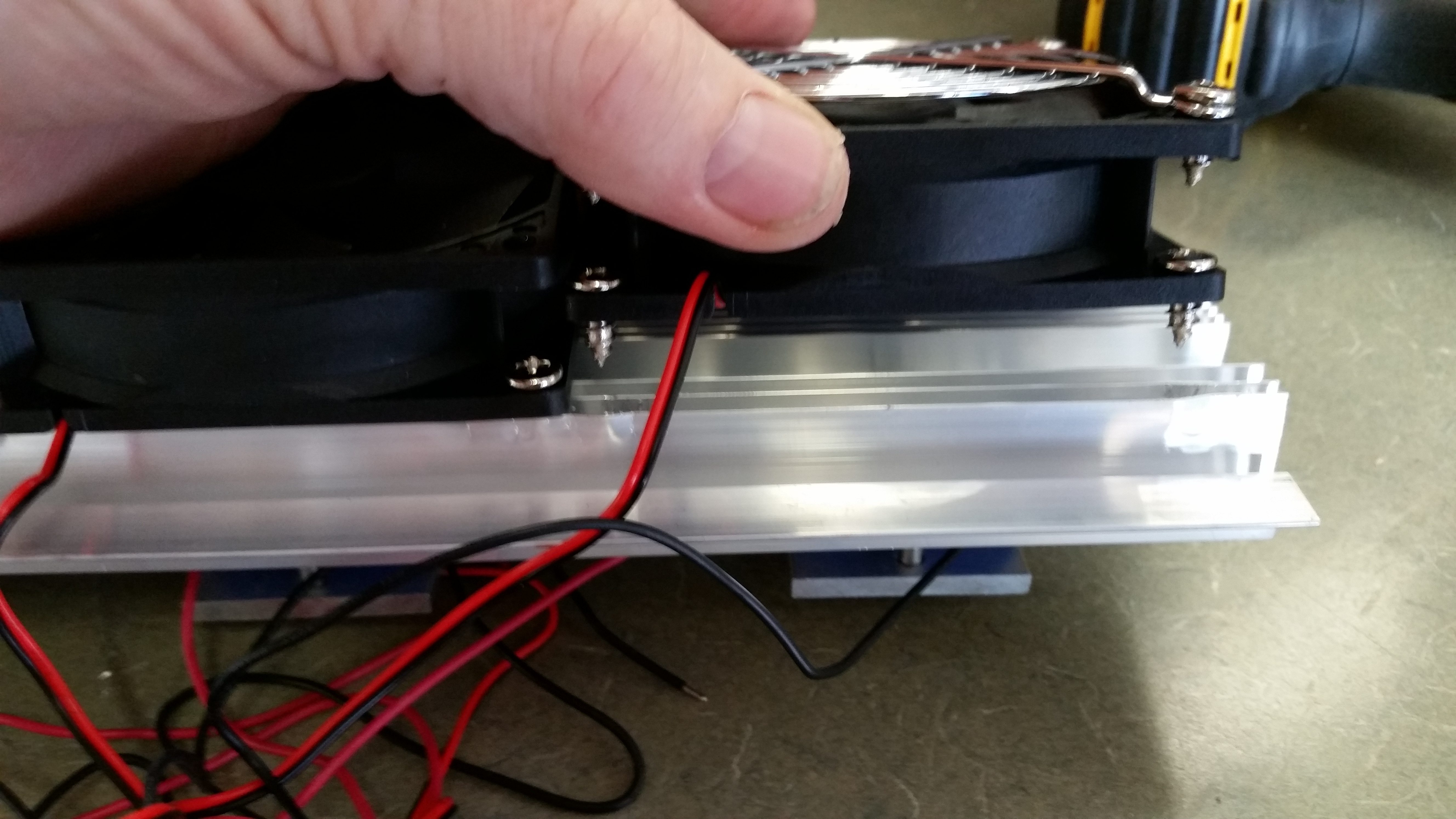 When I received the Peltier cooling Device I noticed that the screws holding the extrusion and fans together were falling off. They were not going to hold the fans on because the fins were too thin to give a good bite . So much so that with little effort I could pull the fans off by hand. I went online and ordered some screws that would go all the way through the extrusion and the first mounting holes of the fan.