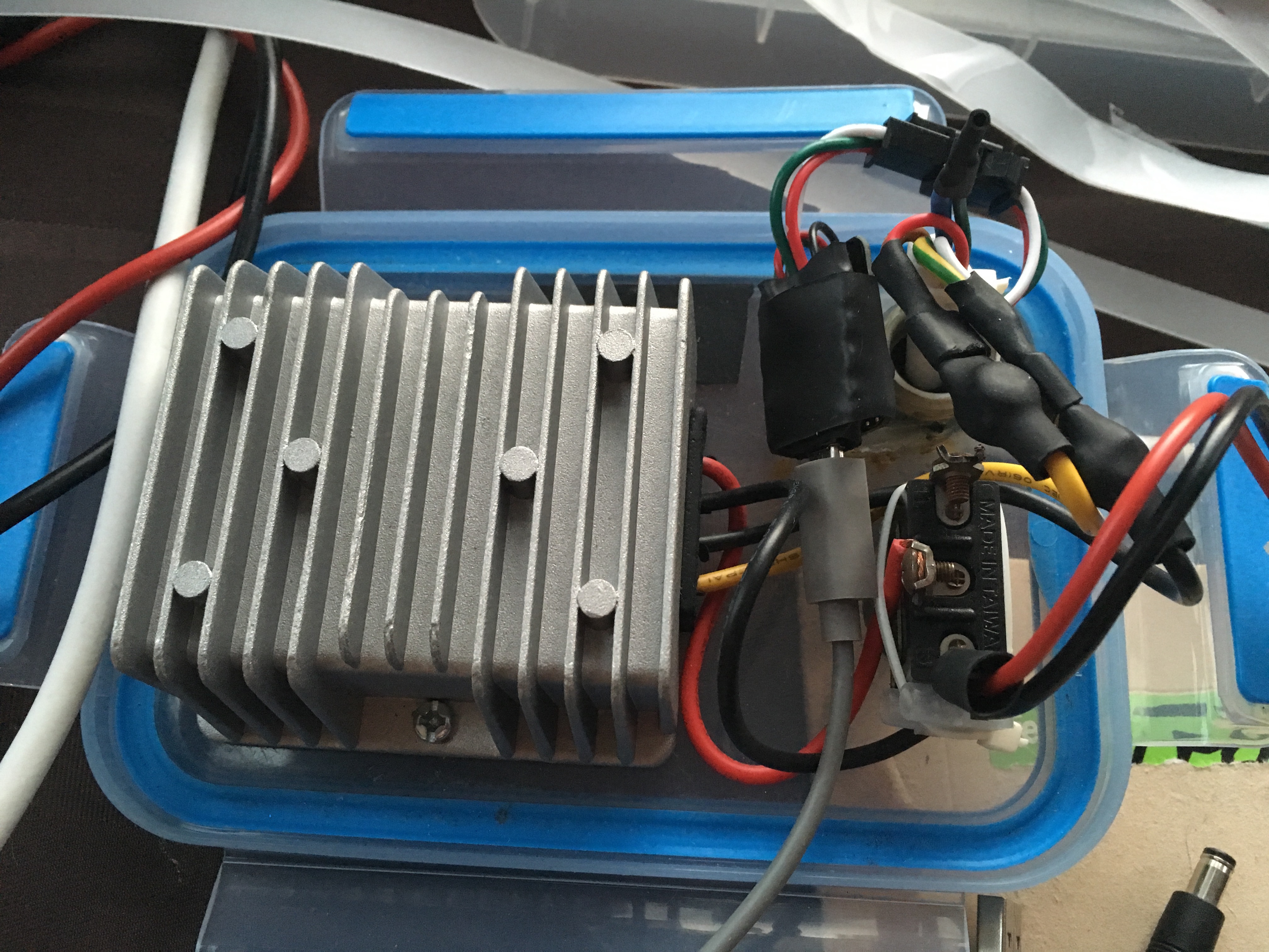 Construction is pretty simple, just stick the silicon-jacketed strips to RHS aluminium with tape and use copper braid at each end for a power bus (power is injected at both ends.) My first experiment with Sugru over the the top of that for weather-sealing and insulation (used the whole 15g I bought, and probably could have done with more.) Not sure if it was the best decision, or if I should have gone for some kind of liquid silicone I could dip the ends into or something. Protip: household power cabling is good for high-current low voltage over short distances, and is cheap and readily available (that thick wire is a bastard to solder though.) The battery/control box is some well-sealed tupperware to keep the dust out.