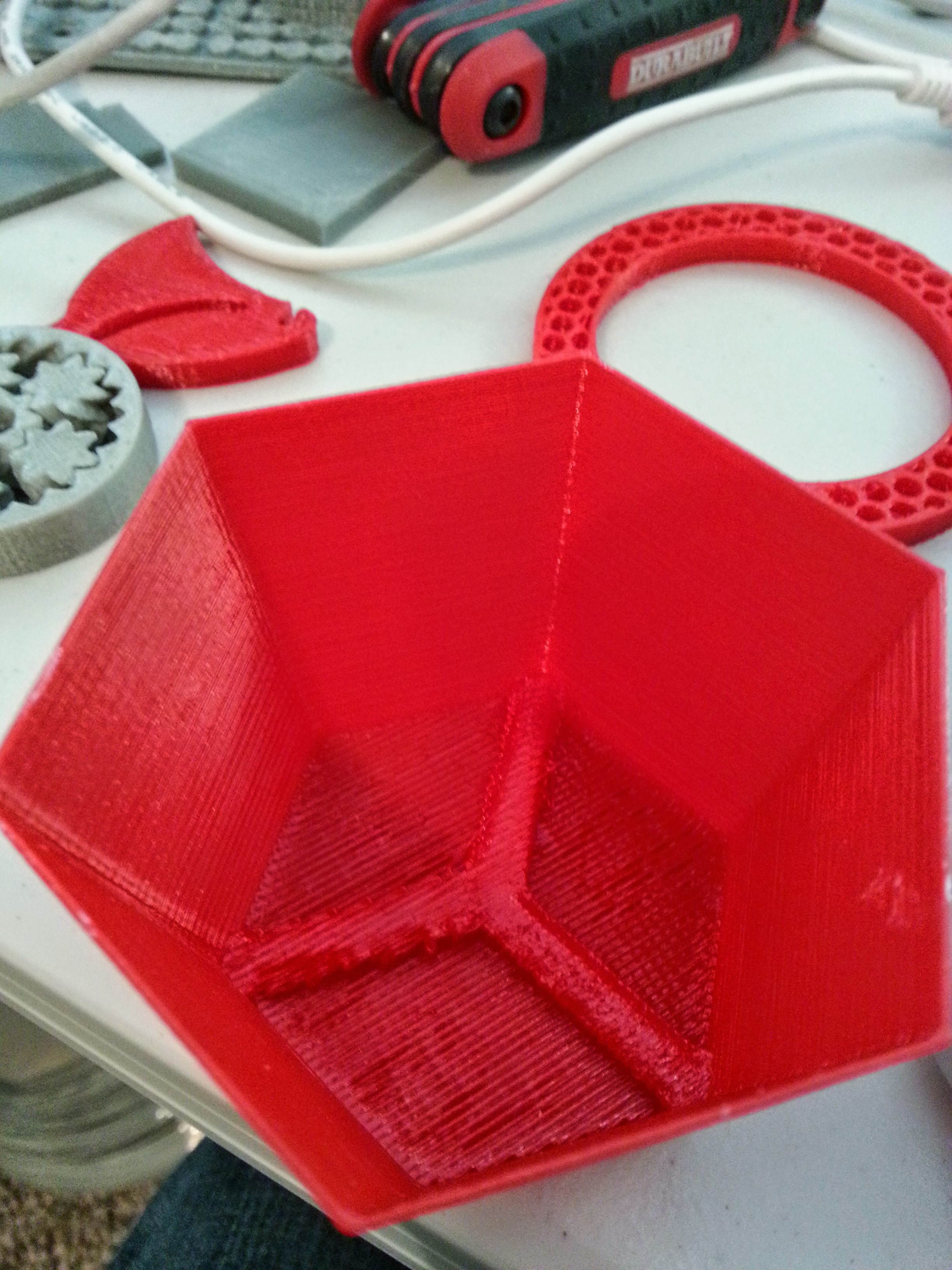 A rather amusing bridging behavior in slic3r 0.9.9. Single perimeter, 0 infill, two bottom layers. Apparently the bridging routine doesn’t take account of the amount of infill behind the bridged perimeters, and assumes that something will be there to anchor the ends of the bridge a few mm behind them.