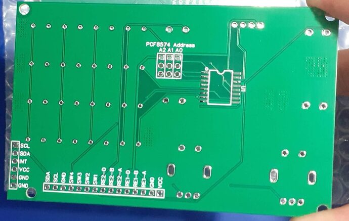 On the back, we have the PCF8574 IO expander for the Matric keypad, addressing Jumpers for the IO expander, as well as the two pin headers for connections to and from a microcontroller…