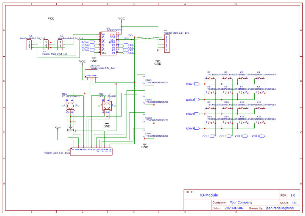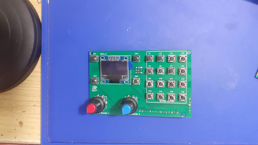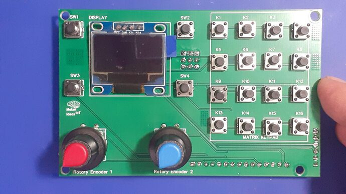 This PCB was designed with my particular work style in mind. I use a lot of I2C devices, IO Expanders, Displays and sensors. It would thus make sense to have I2C on the PCB, to control an OLED display, as well as a PCF8574 IO expander, that is used to drive a 4×4 Matrix Keypad. Two Rotary encoders, as well as another 4 standard push buttons completes the PCB…