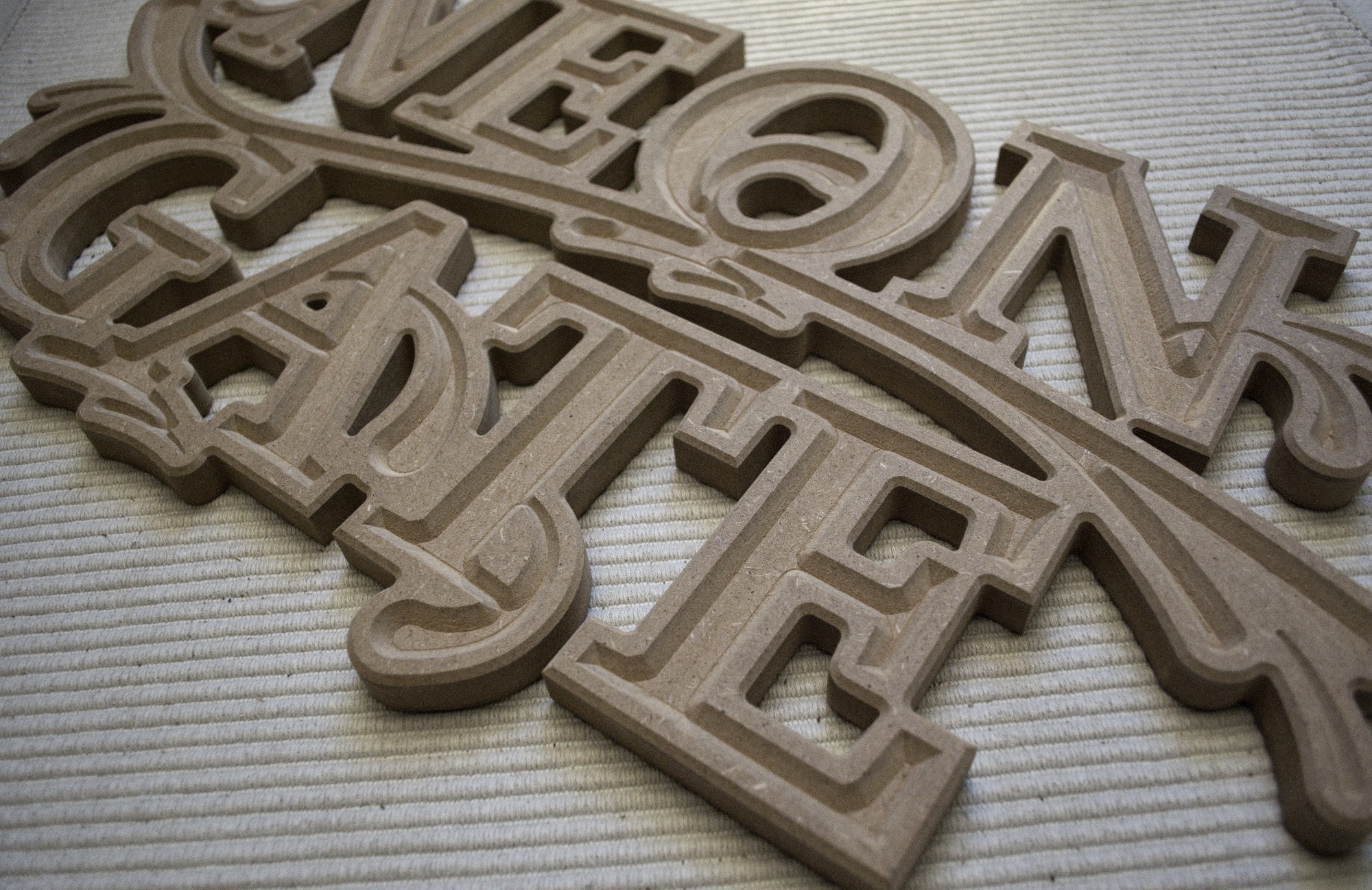 A typographic demo-piece with pockets and V-Bit bevelling for my wall. I want to paint it in white and neon orange. Here is a picture of the raw and unfinished milling…