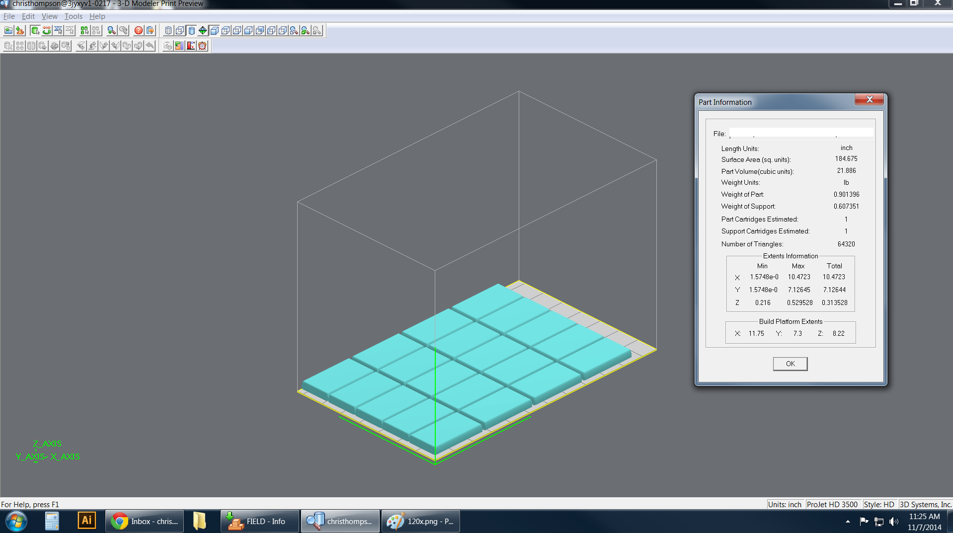 At @NextFab we have a 3D System Projet HD 3500 Plus material jetting machine. We print contract jobs on it often, but rarely jobs with the volume or number of parts as a recent request for 400 test coupons. (I don’t know what they are for. We rarely do.) In order to maximize the printer time, I filled the available volume with parts. I quoted the job and got approval to run it. This is where we found some problems. First, the machine would fail to start with 400 bricks in the bed. Frustrating, but the workaround was cutting the job in two.