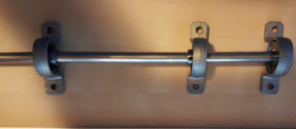 A while ago it was mentioned that pillow blocks could be used instead of printed parts for holding the bearings. I gave it a shot and this picture shows the result of some KP008 parts from http://www.aliexpress.com/item/4pcs-8mm-KP08-kirksite-bearing-insert-bearing-shaft-support-Spherical-roller-zinc-alloy-mounted-bearings-pillow/1739080976.html