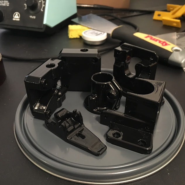 Acetone vapor smoothed parts (Black ABS from Atomic Filament) for my ongoing Tria build. Used a cold vapor method.