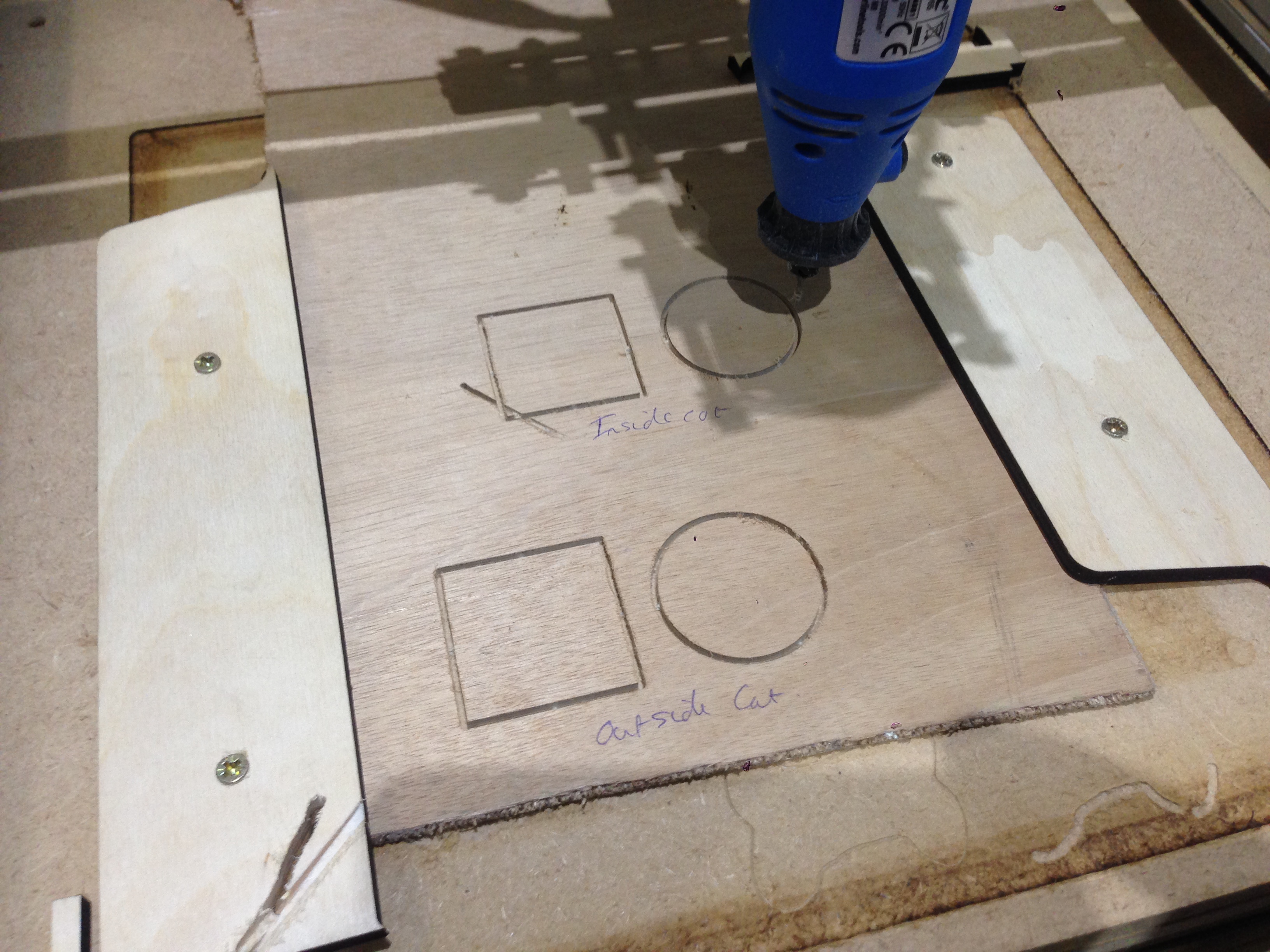 After a long day footering with my X, Y & Z step/mm settings I have finished the day with a 40mm Square & Circle cut out inside and outside. Cut with a 1.4mm dia bit. I am observing some slightly wider than expected cuts. I think this is to do with the quality of the dremel look a like and seating of the collet. I think there is 0.2 to 0.4mm play on the diameter of the cutter. Other than that a very successful day