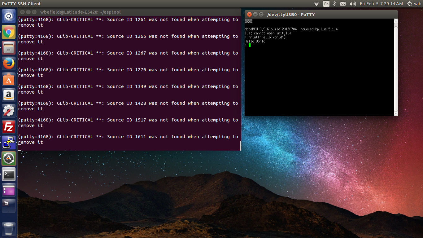 After lots of googling, I was finally able to flash my NodeMCU and run “Hello World” from Putty. yay!