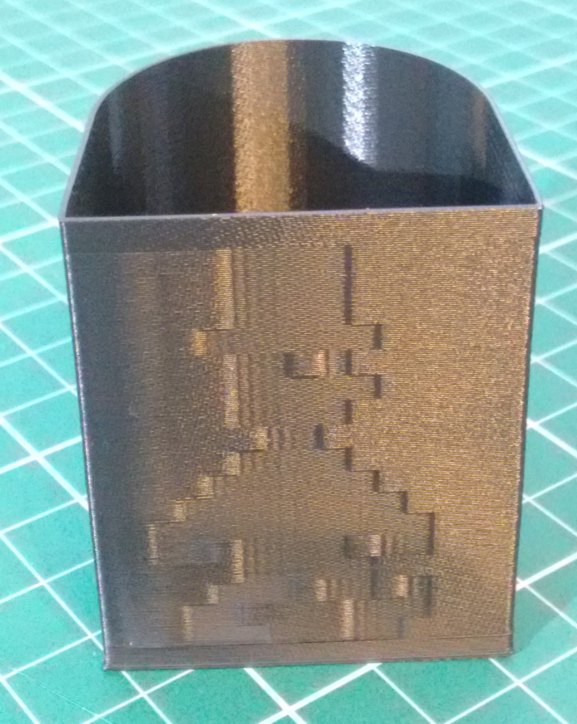 After reading @Mark_Wheadon 's recent post, I thought I’d play with a simple spiral vase tealight holder changing the printing speed on a flat surface. My first attempt (10x16 w/2 colors) came out okay but the second (230x296 w/16 colors) was probably a bit ambitious (but topical). I’ll probably try it again with the image scaled down a bit more first (and after making sure the screws on the arms of my delta are tight).