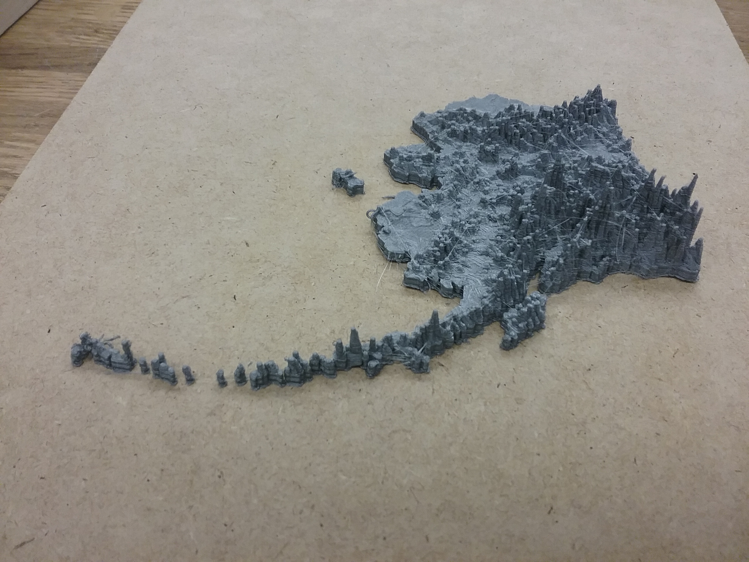 Alaska Topo 3d Print, using PLA on BCN3D Sigma. The print was printed directly on a 1/4 piece of mdf and the mdf will be used to display these piece.