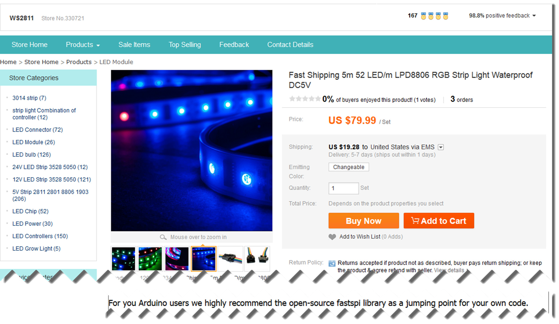 AliExpress Store WS2811 recognizes FastSPI for Arduino users…I found this on the LPD8808 strips. @Daniel_Garcia @Mark_Kriegsman , you guys must feel good about getting shout-outs from overseas!