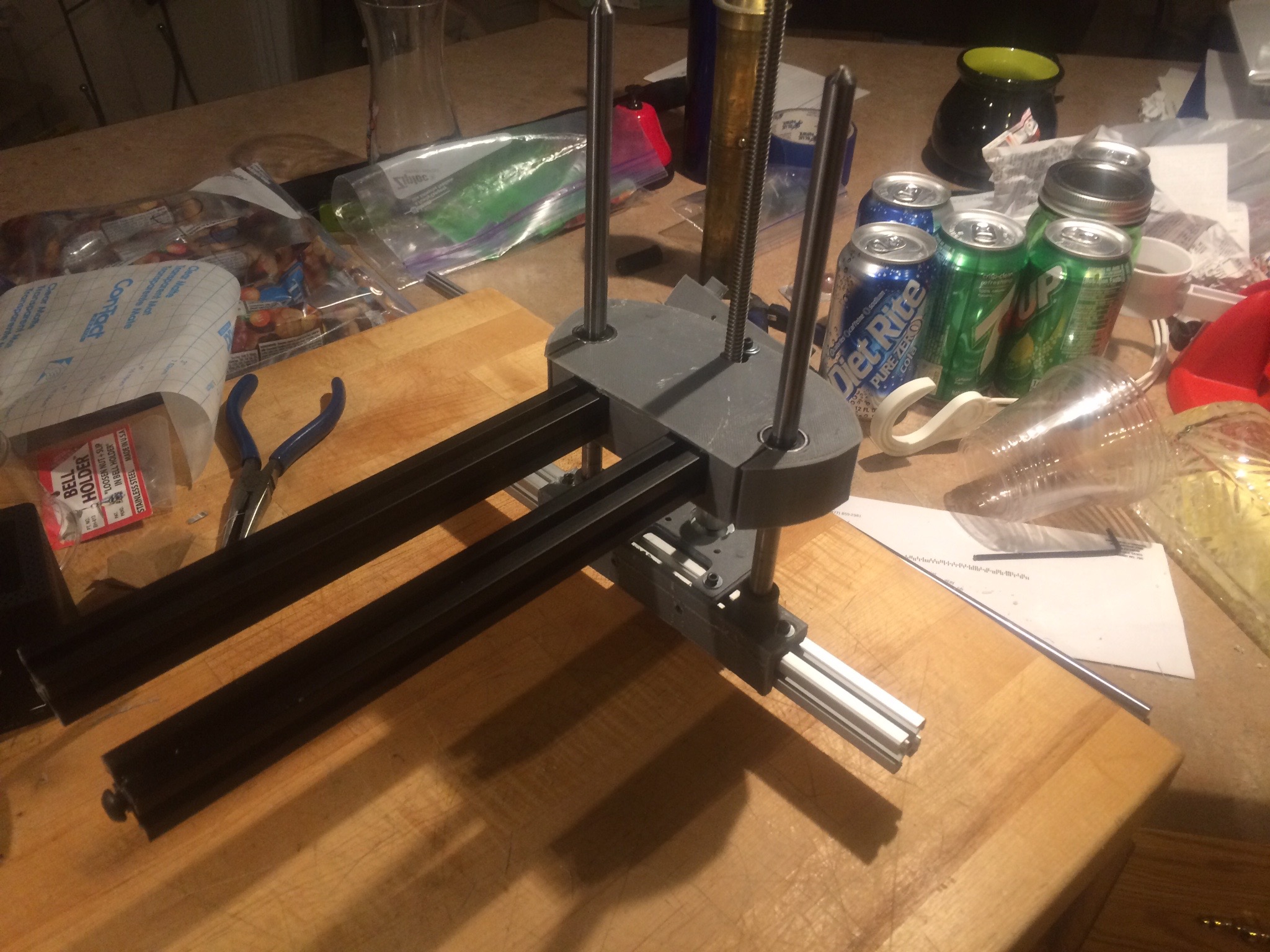 Alpha release Z-stage. Scrap rod, leadscrew not yet cut to length, could be duplicated on the other side if the bed got larger than wise for a cantilevered bed. The built plate will be on 3 points for easy tram adjustment.