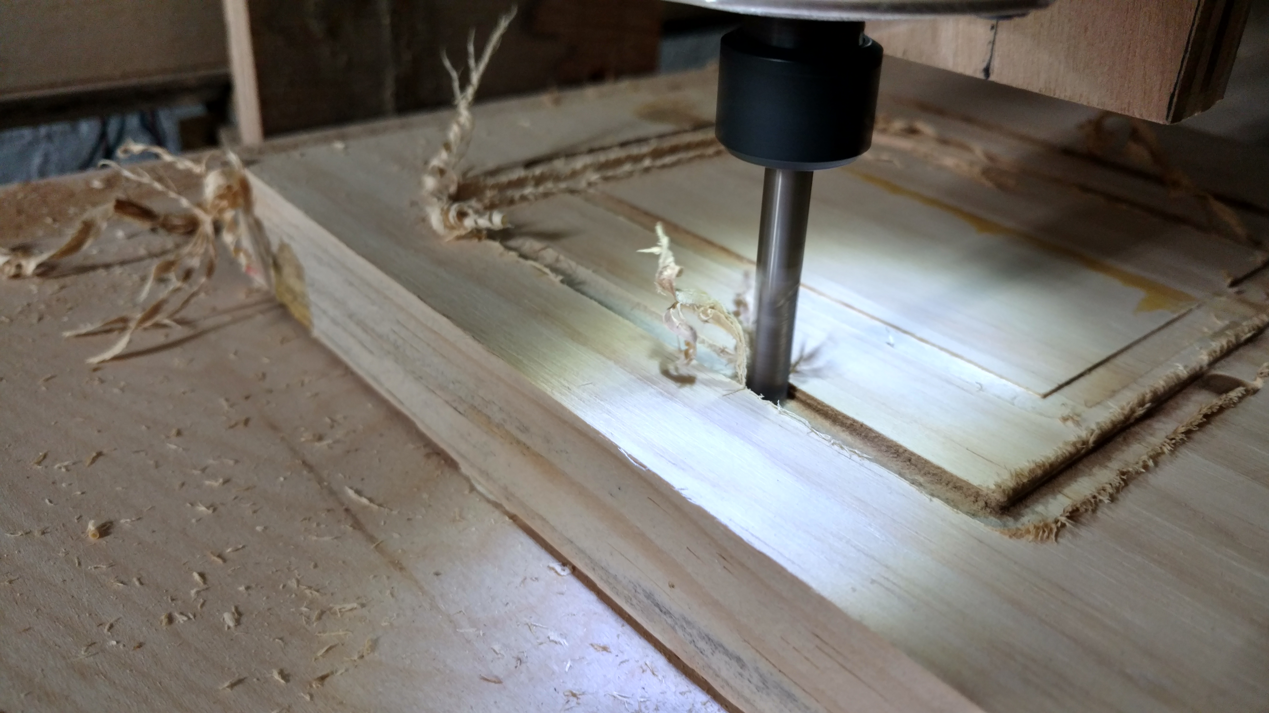 Feed rate is 150 mm/min (I think), and the bit is a 1/4 inch, 4 flute up cut. The bit might be a little burnt… I’m still trying to work through feeds and speeds.