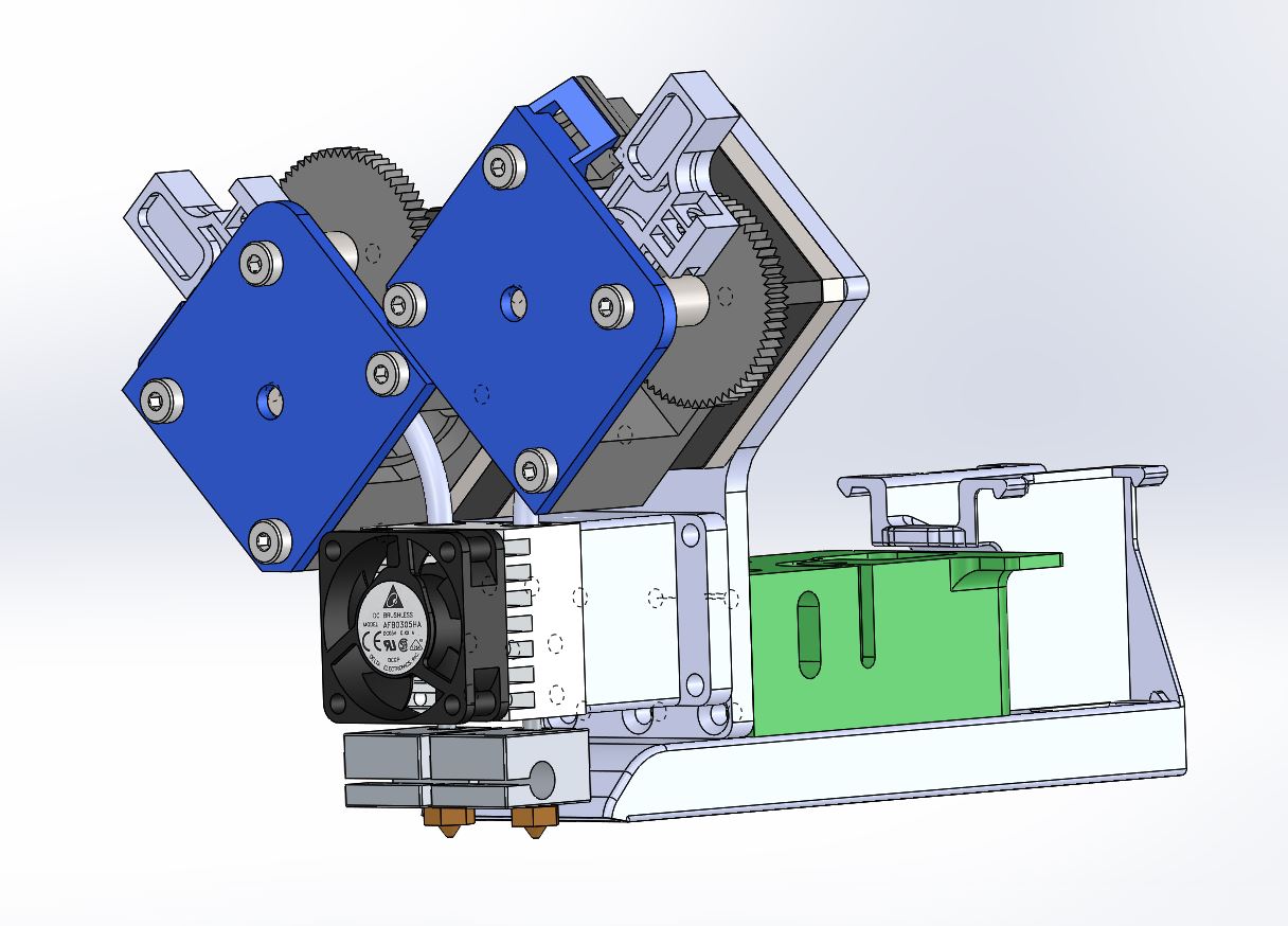 An upgrade of the Dual Felix 3.0 to E3D Titan extruders. I previously designed a mount for the E3D Chimera hot end using the original stepper motors. This design uses two small steppers mounted diagonally on a printed frame. I’ll switch to an aluminum mount plate for the motors after testing.