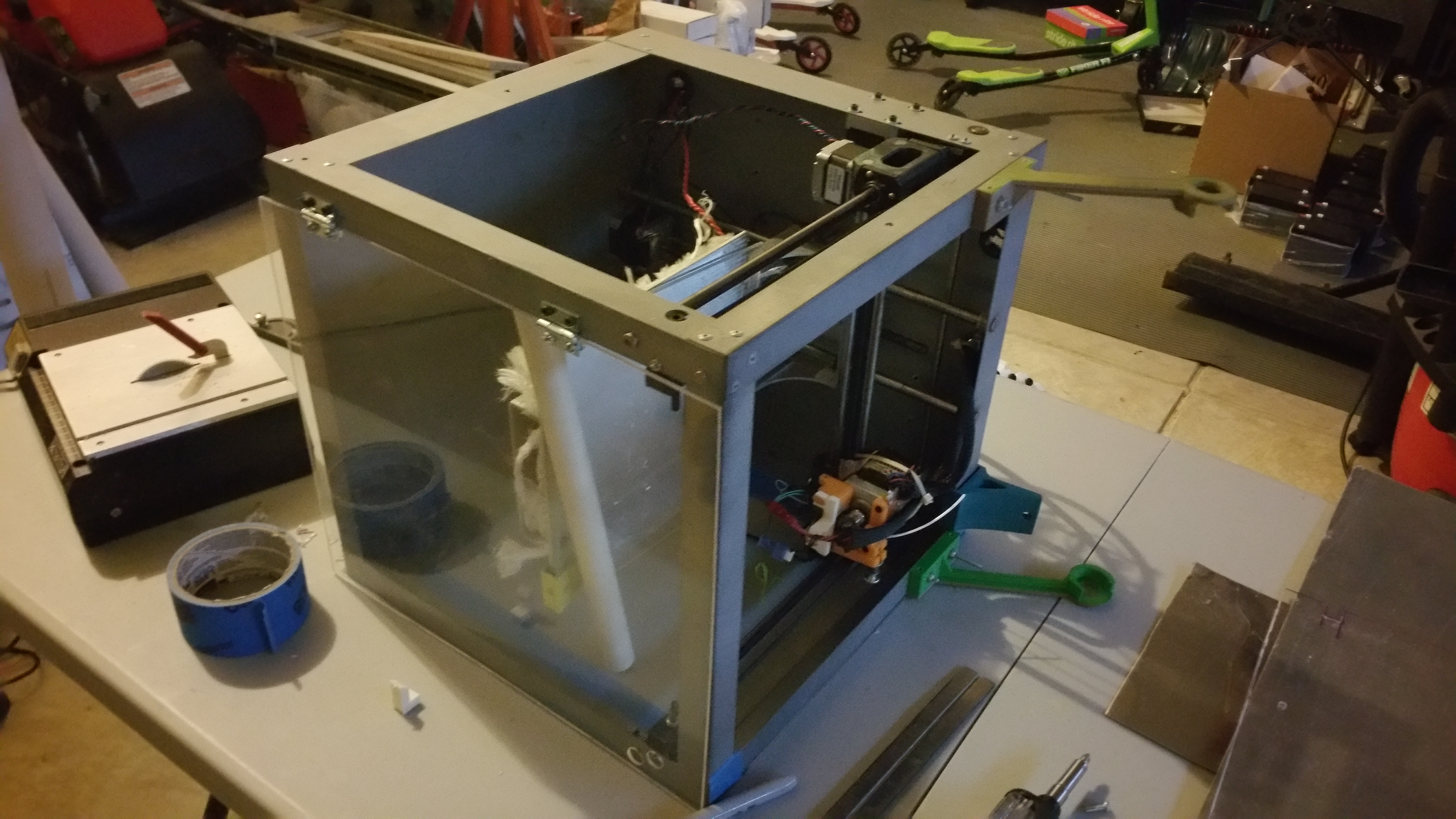 And the saga continues. Here’s the old SD3 lying on its side with the acrylic side I had cut 3 years ago removed. Ready to cut out aircraft grade aluminum (yes, I have a lot of it and yes it’s left over from building a plane), is the metal replacement. Why? Why because if I decide to mount a laser in there I don’t want to go blind. That’s why. The walls should be on tomorrow and the board installed. With any luck we can test for motion. I have to design and install a replacement hot end mount in the original carriage before printing can begin. I’m going to use a Bowden set up so that I have room on the carriage for the laser. +Ray Kholodovsky is going to like that hooked up as the optional extruder.