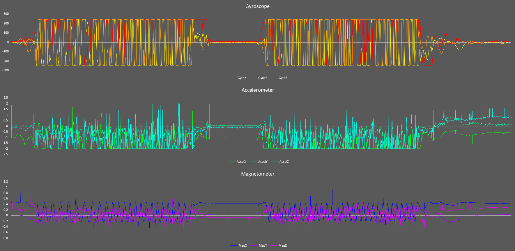 And this is a plot of the data when it’s spinning freely (or attached to a POVpoi stick, no wires to restrict its movements.) First half is spinning clockwise while the other is counter-clockwise. Unfortunately, they’re both the same. The one instant on the second half where you see more red is because the whole thing was rotating along its length (in other words, the spindle its attached to is doing its job and allowing it to rotate in mid-air.) I think I’m going to start trying different sensor angles and figure out which one will get me what I need. When you guys get tired of seeing these, let me know and I’ll do some POV captures when it gets dark.