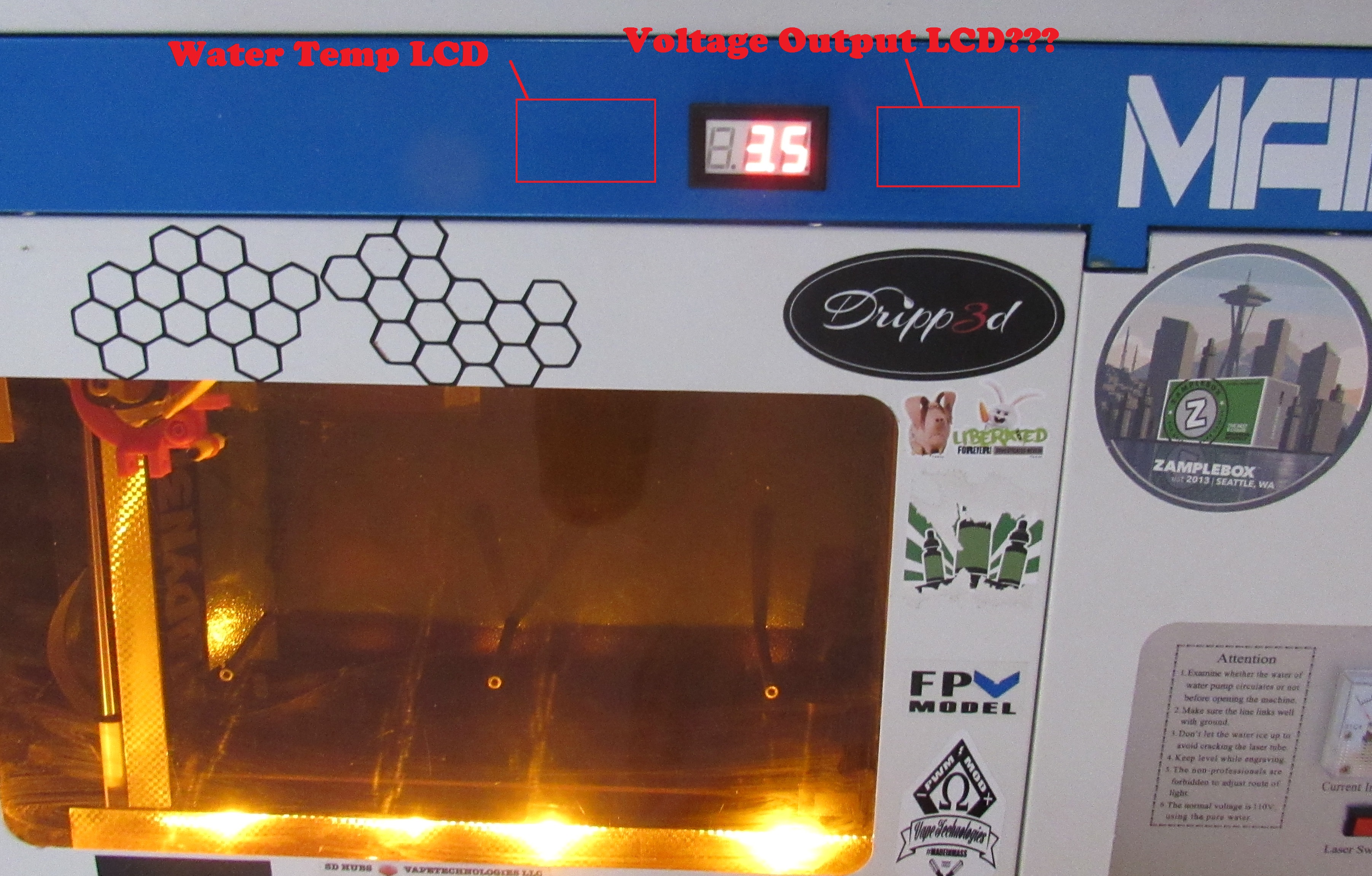 If you notice the red DVM LCD I already have on the machine, that just reads the voltage for the lipo pack powering my LED’s inside the laser, as well as a ‘CREE’ HID LED as a “head light” on the laser head. Very bright. Total draw for all of the lighting inside the machine is about 35mah. Not very relevant to this post but just a memo.