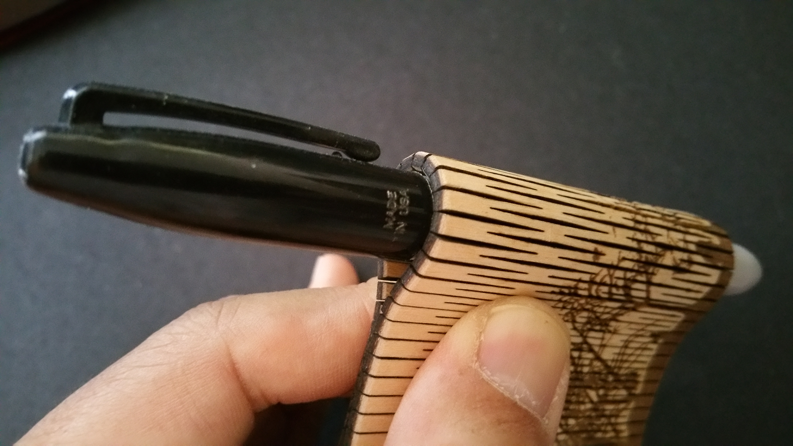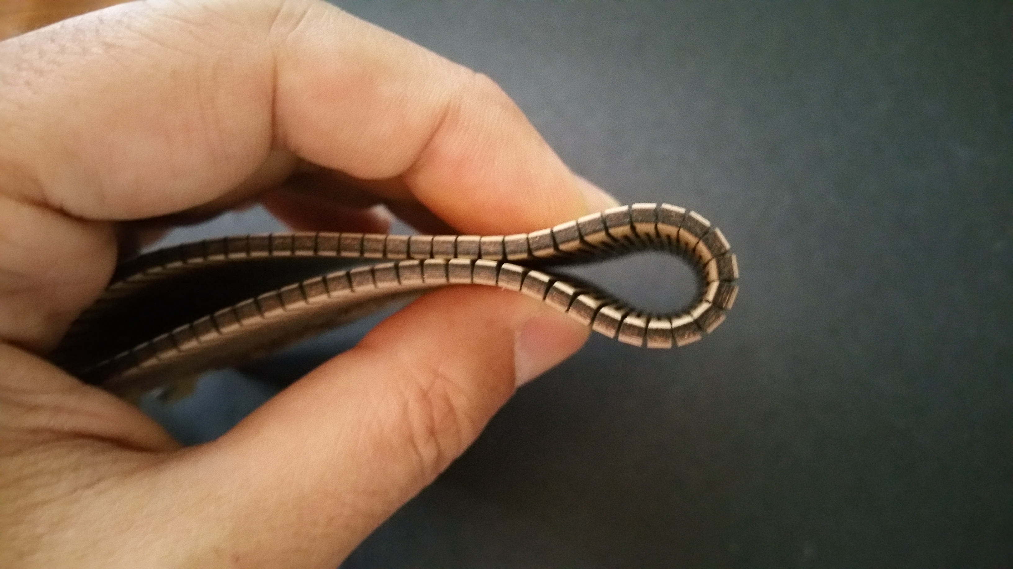 I ended up doing some test pieces myself, using just the simple, straight lines design. I created test pieces starting with 3mm gaps, decreasing till I got to 1.5mm. The closer the slits, the more flexibility you have. With the attached image, remember that you’re looking at the edge, so the gaps appear larger, but there’s another slit cut in between the ones you can see.