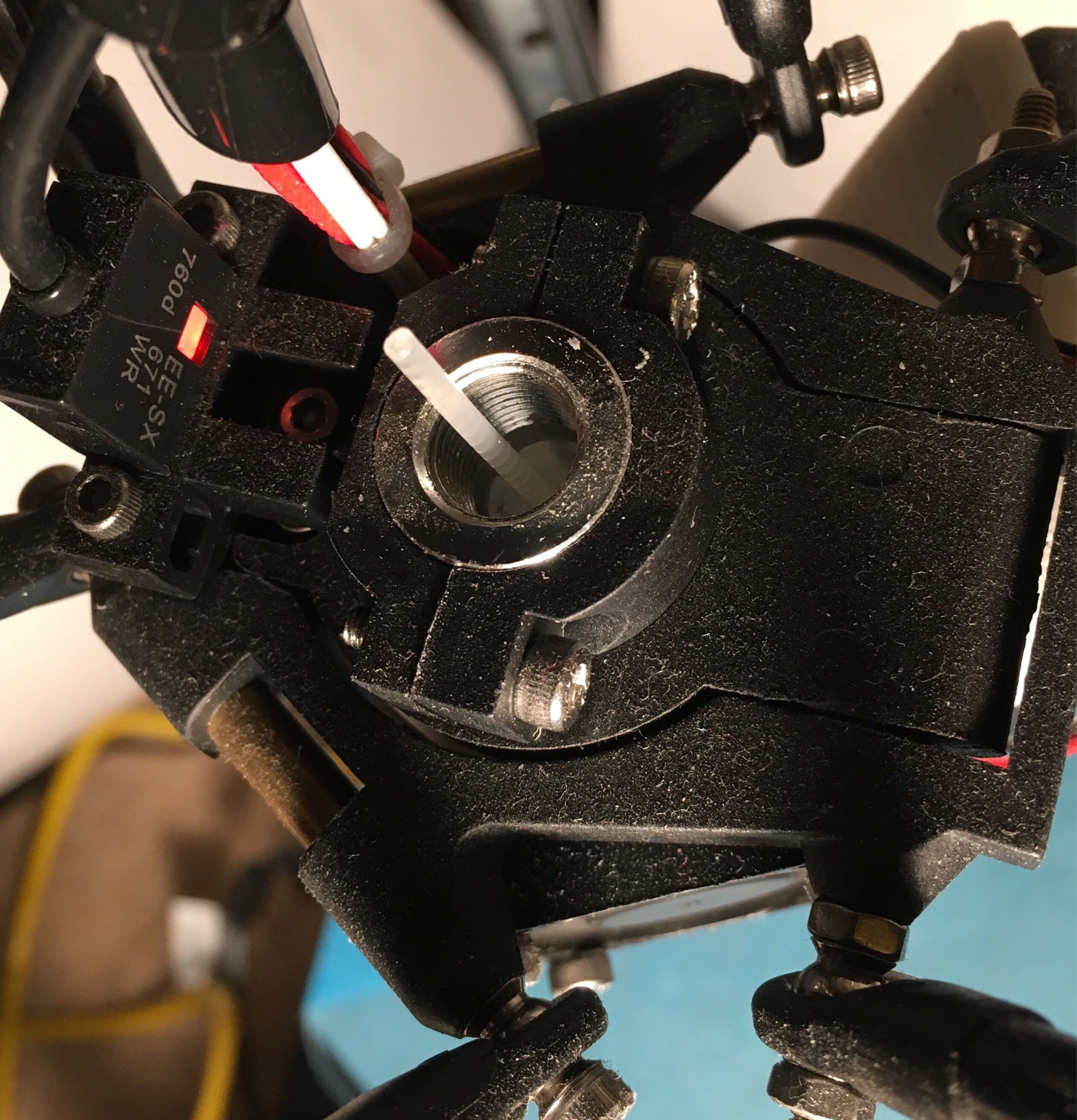 Finally I remembered that the lower end of the catheter could be screwed off. There was no heat in the metal screws. Once open, I saw another broken end inside the effector. Using a tweezer, it did not require too much effort to remove. (The first picture shows the broken end half yanked up. The full stretch is in the second picture, revealing the melted tip.) Phew - again. It is not time to worry yet, like Atticus Finch used to say.
