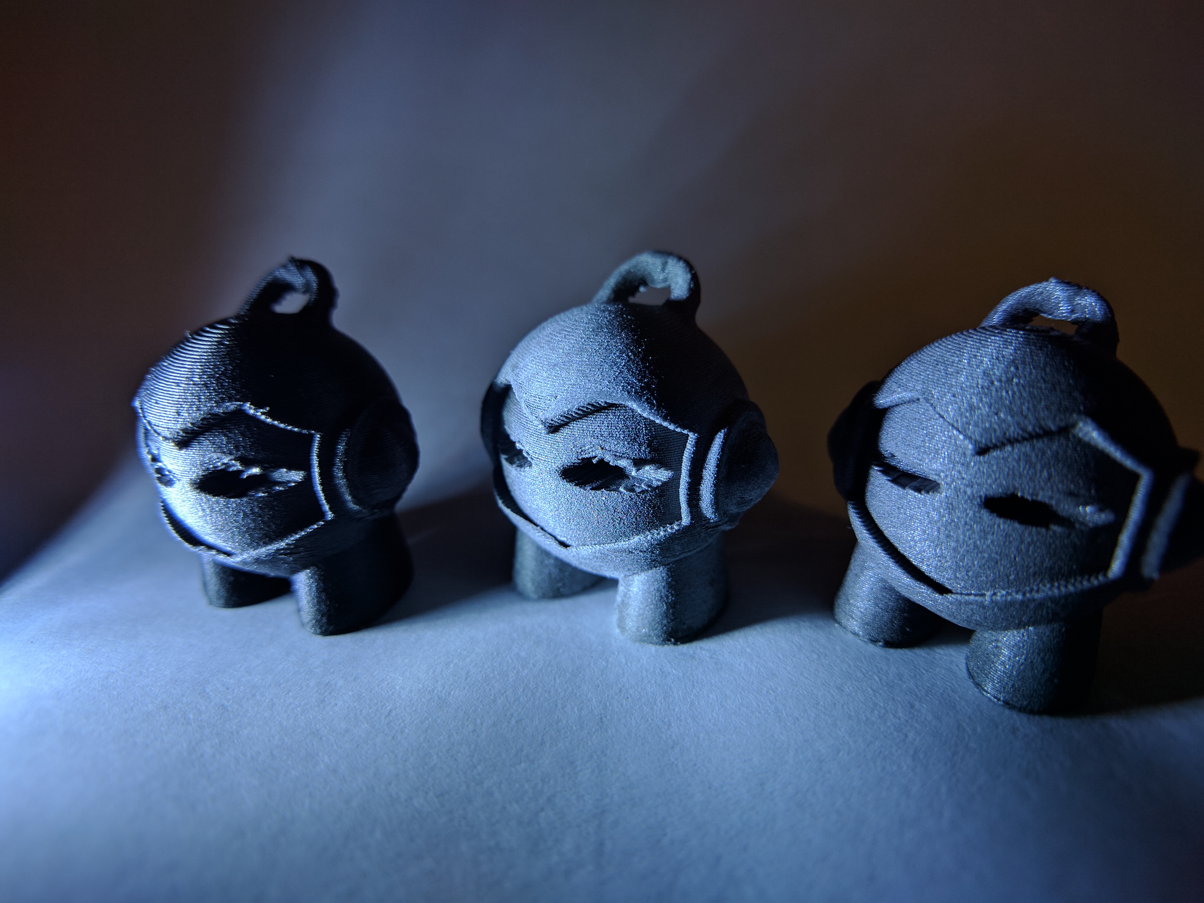 Army of Marvins. From left to right, carbon fiber PLA, stainless steel PLA, and Iron PLA. I’m impressed with the quality of the filament. Once I sorted my blockage in the hotend, things came together nicely. Thanks again for those that helped me out!