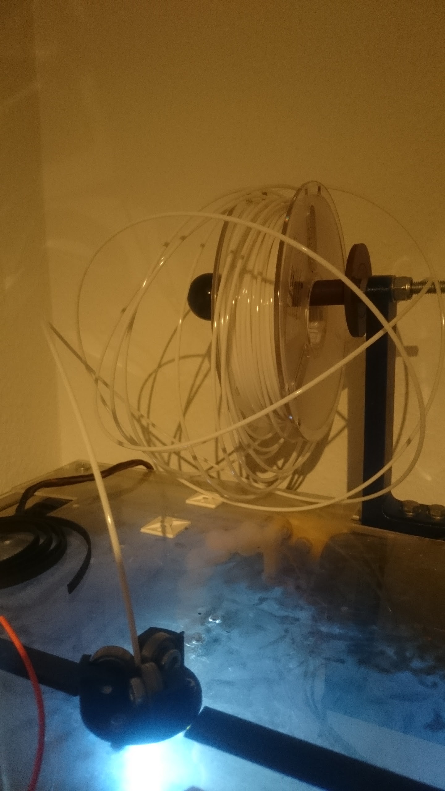 I used to have that problem when my filament spooled vertically. 10 and 15 pound spools would tip past the center of mass(cuz they’re never balanced axially) and then swing over, sometimes with enough force to rip the filament out of the extruder or jerk the extruder sideways on the axis. To fix that I used a one-way bearing to mount it and then it wouldnt swing back once it passed the center of mass over the top. So much easier to sit the spool horizontal on a lazy susan. No swinging, no unspooling, no muss, no fuss. Bearing plate is like $4 on mcmaster. 3d printed a cylinder that fit the center of the spool and matched the holes on the plate. 0 problems with the horizontal spool.