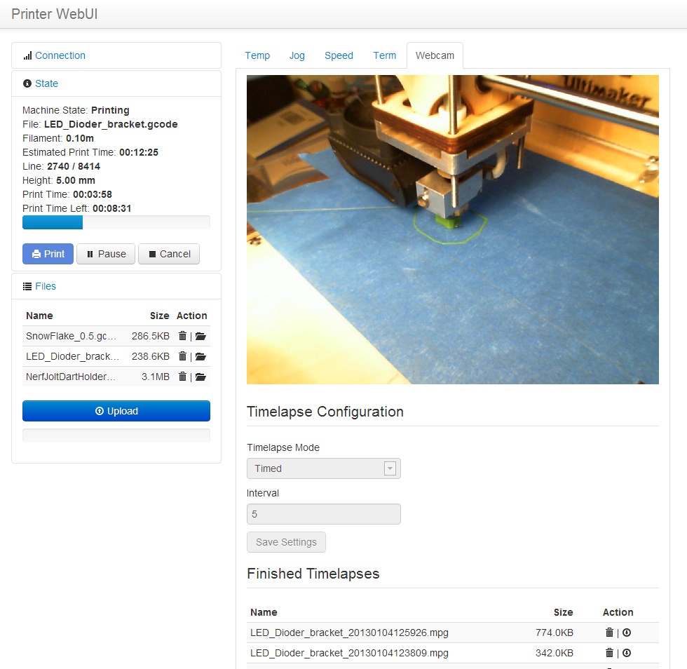 - optional: creation of timelapse recordings of the printjob via webcam stream (using e.g. MJPG-Streamer) – currently two timelaspe methods are implemented, triggering a shot on z-layer change or every “n” seconds