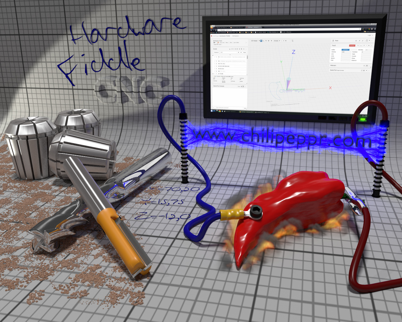 Tore, it’s awesome. I love all the detail in the picture–the chilipepper, the XYZ coords scribbled on the grid, the hardware fiddle on the wall. It’s really fun.