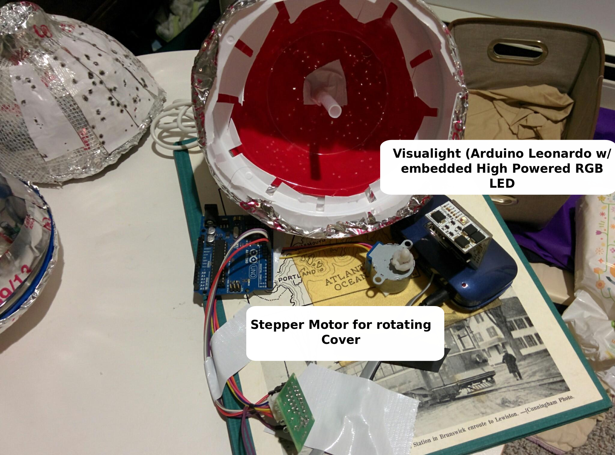 Great project. Can you post where you sourced the lighting? When I searched for visualight Google returned a light bulb. Also, did you consider using a continuous rotation servo? You could drive that from the trinket and eliminate the Uno.
