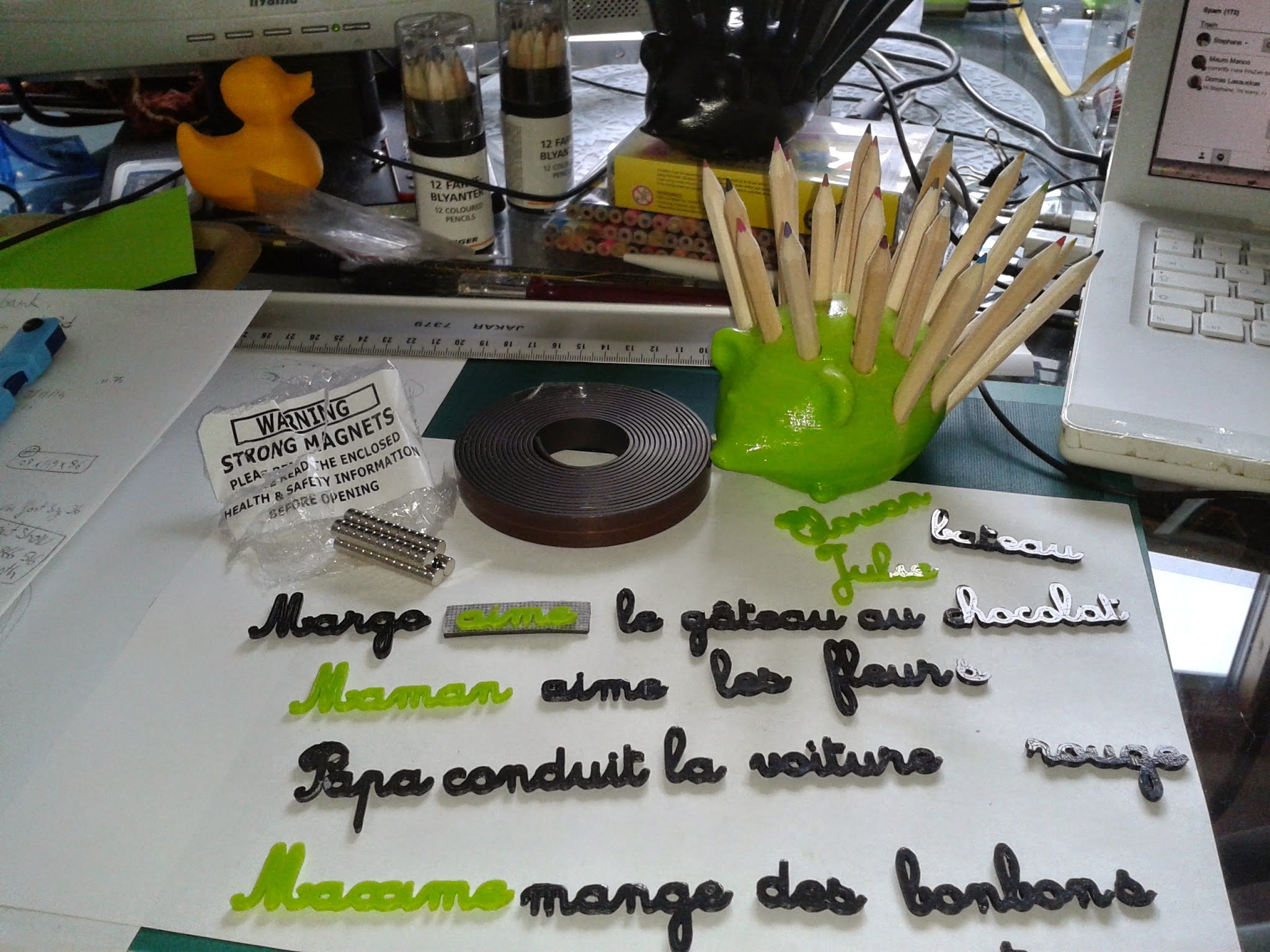 This is for my grand child (3 yo), to make a game called “build sentences” to tell stories. (“Faire des phrases” in French). The approach is to used words and not letters wich will be too fastidious for a first contact. (a second stage could bring in grammar with the help of some colors)