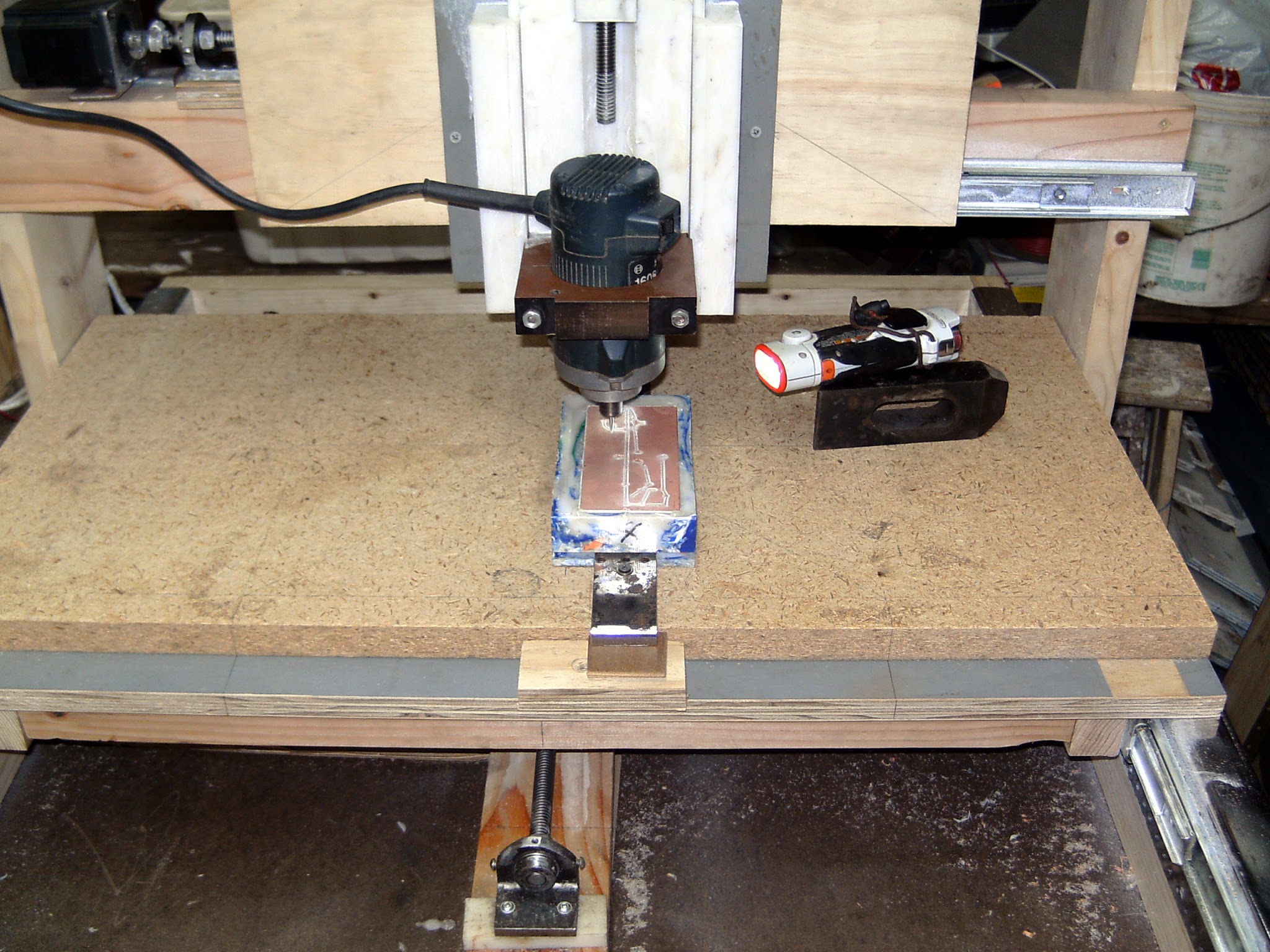 Bah it almost worked. I’m still going to use this board, even though I screwed it up. In all the excitement I failed to get the engraving bit running true in my router. I won’t make that mistake again. The bit being somewhat askew in the collet adapter, it plowed out too much material by describing a circle, while it was spinning. But this is the very first board I ever tried to isolation route on my machine. So for me even these poor results are promising. As I know what went wrong, and I can take steps in the future to fix it.