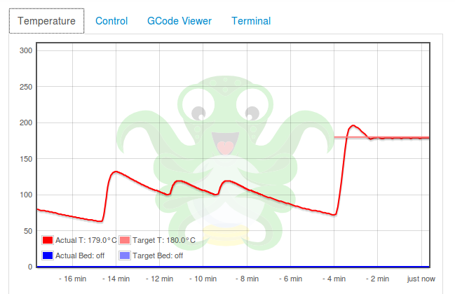 Baseline PID Autotune. What you see in this picture is the result of running an M303 with no additional parameters on a Hexagon hot end with no fan. That causes a 3 cycle Åström-Hägglund (relay) tuning around 100 degrees. Following that, the temperature is set at 180 degrees. The overshoot is too high and there is some ringing after.