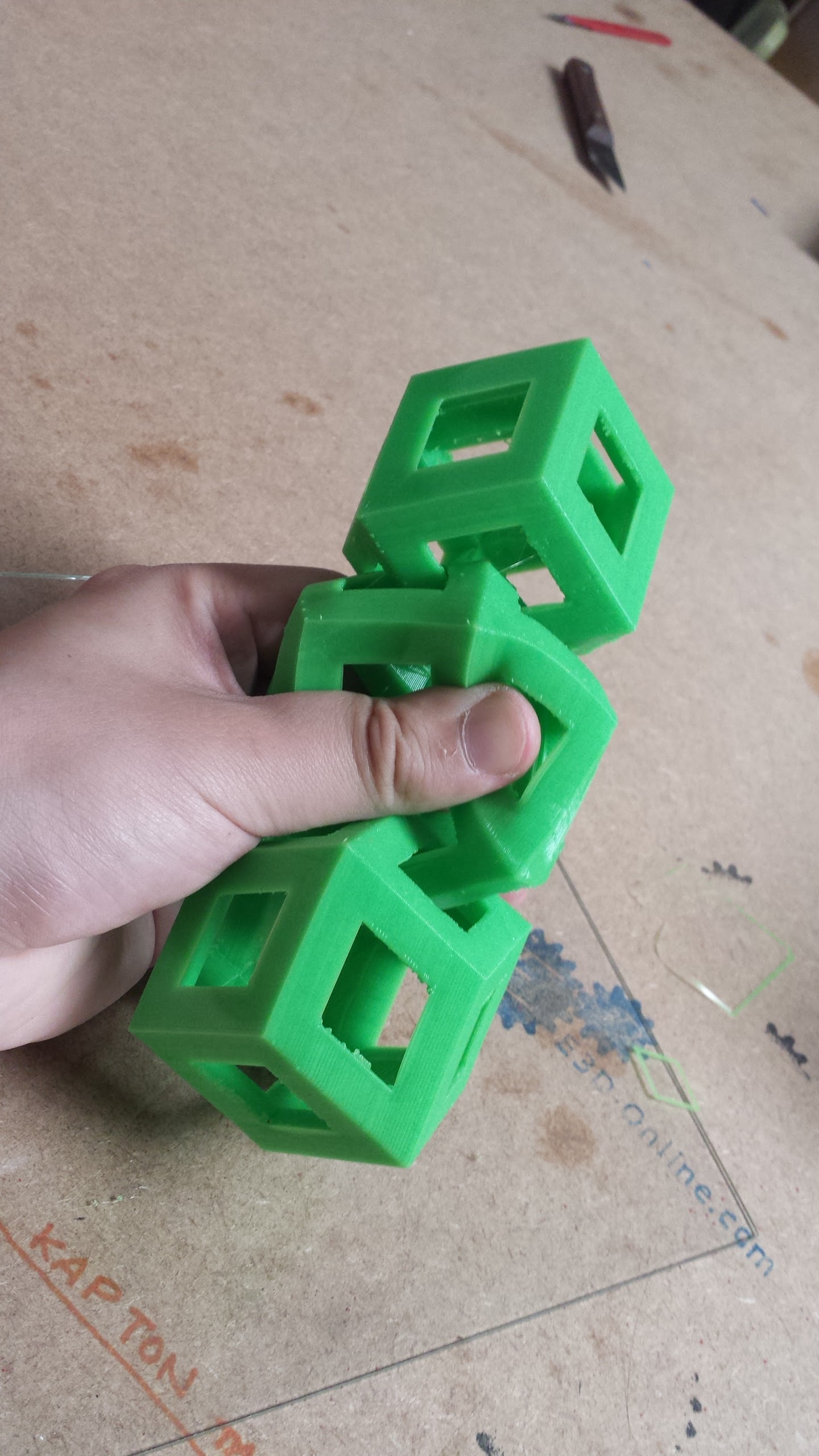 Emmets dodeca chain, scaled up 150% and cut down to just 3 links. Mendel90 with an E3Dv6 printing grass green ninjaflex. 223c nozzle / 75c bed. 1.3mm retraction at 75mm/s. 20mm/s print speed for all parts of the print. 150mm/s travel speed. Cura.