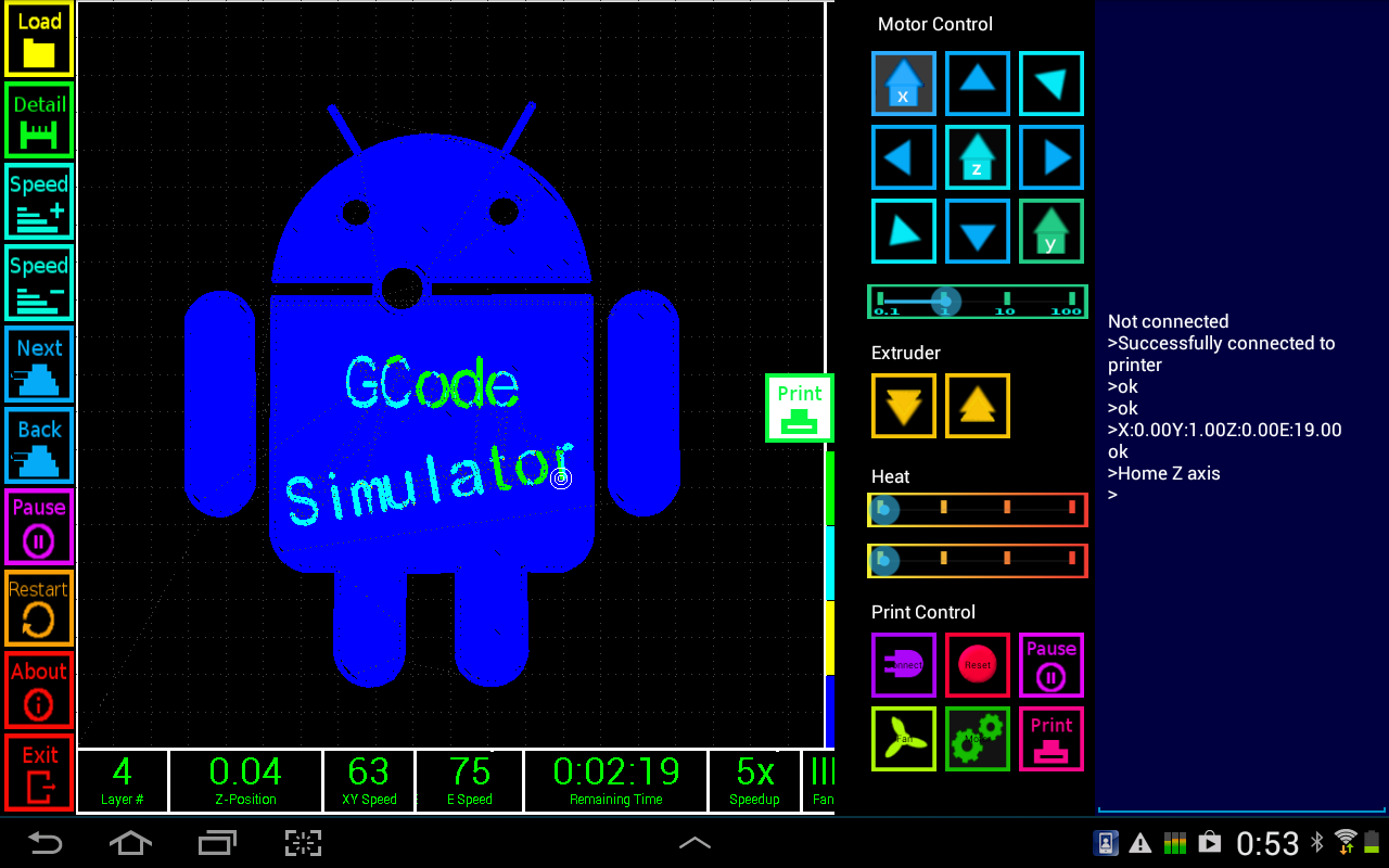 The new version adds a printer control panel which can control a 3D printer (Sprinter,Marlin,…) using a USB OTG cable.