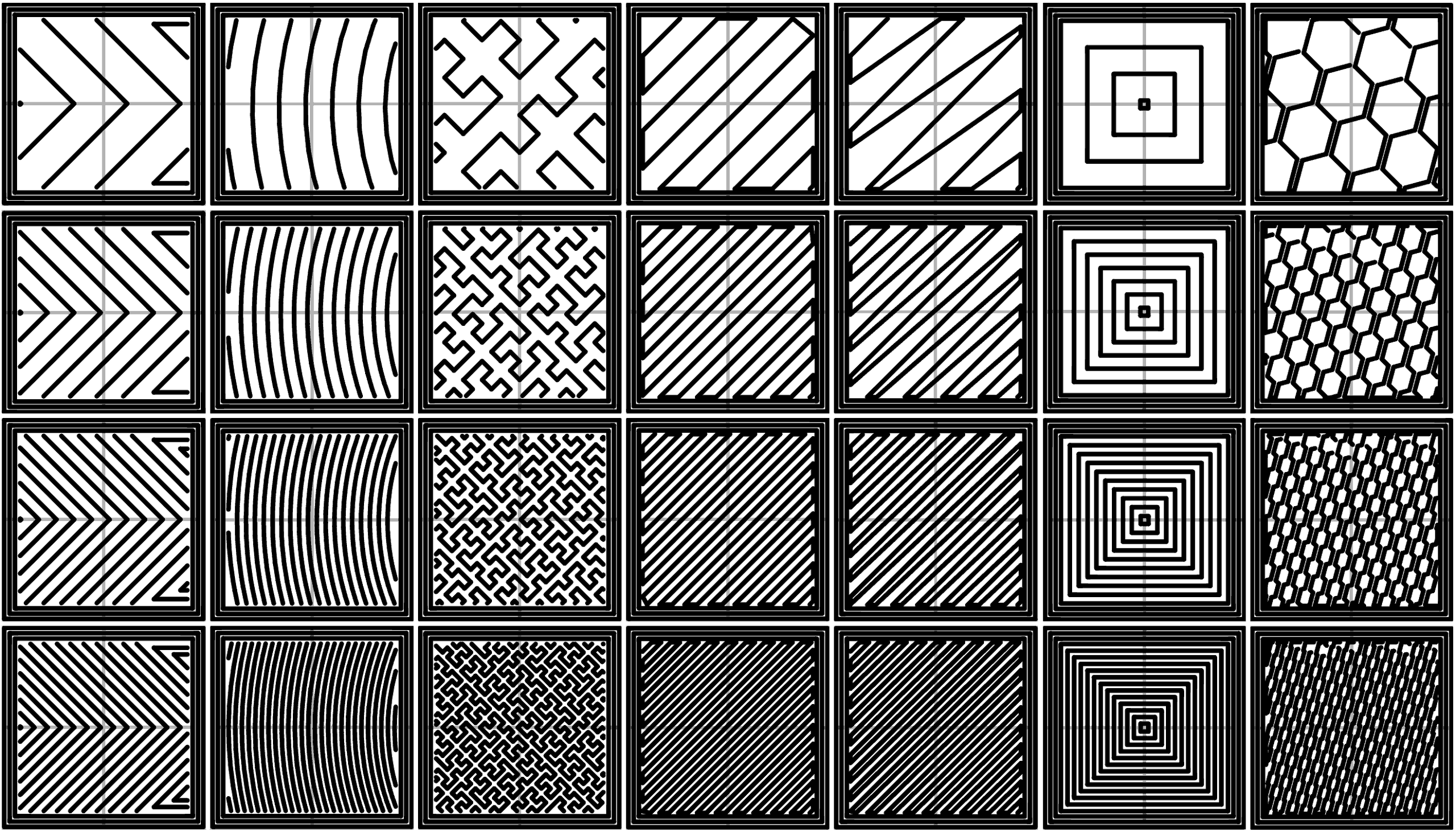 I played with honeycomb for a while, but found it just simply created a lot of vibrational stress on the machine, and also increased print times a bit due to acceleration/jerk. I use the 5th from the left. It alternates pattern direction, so it actually ends up looking more like a cross hatch, and it’s time efficient and doesn’t cause the machine to vibrate wildly.