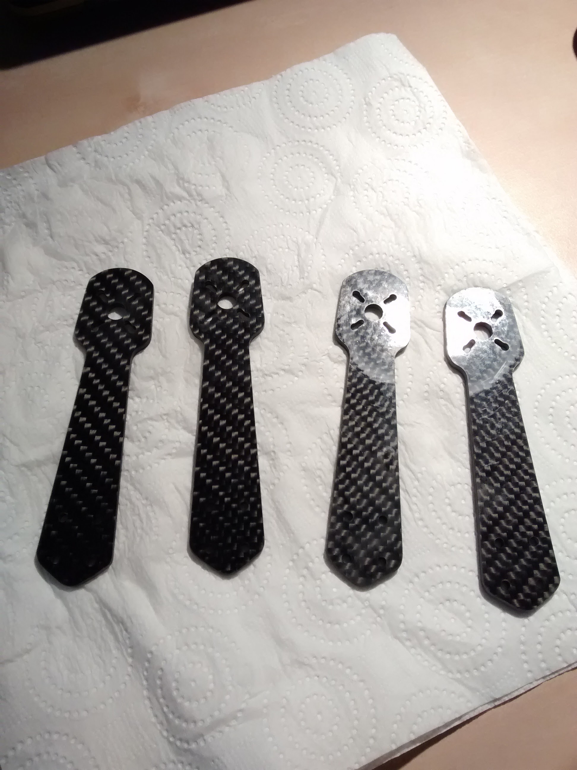 Carbon fibre machining, using spray adhesive to tack to a scrap piece of MDF and clamping only the wood down. 2mm 2 flute end mill, 400mm/min (conservative) and 1mm doc. Use white spirit to clean spray adhesive off parts