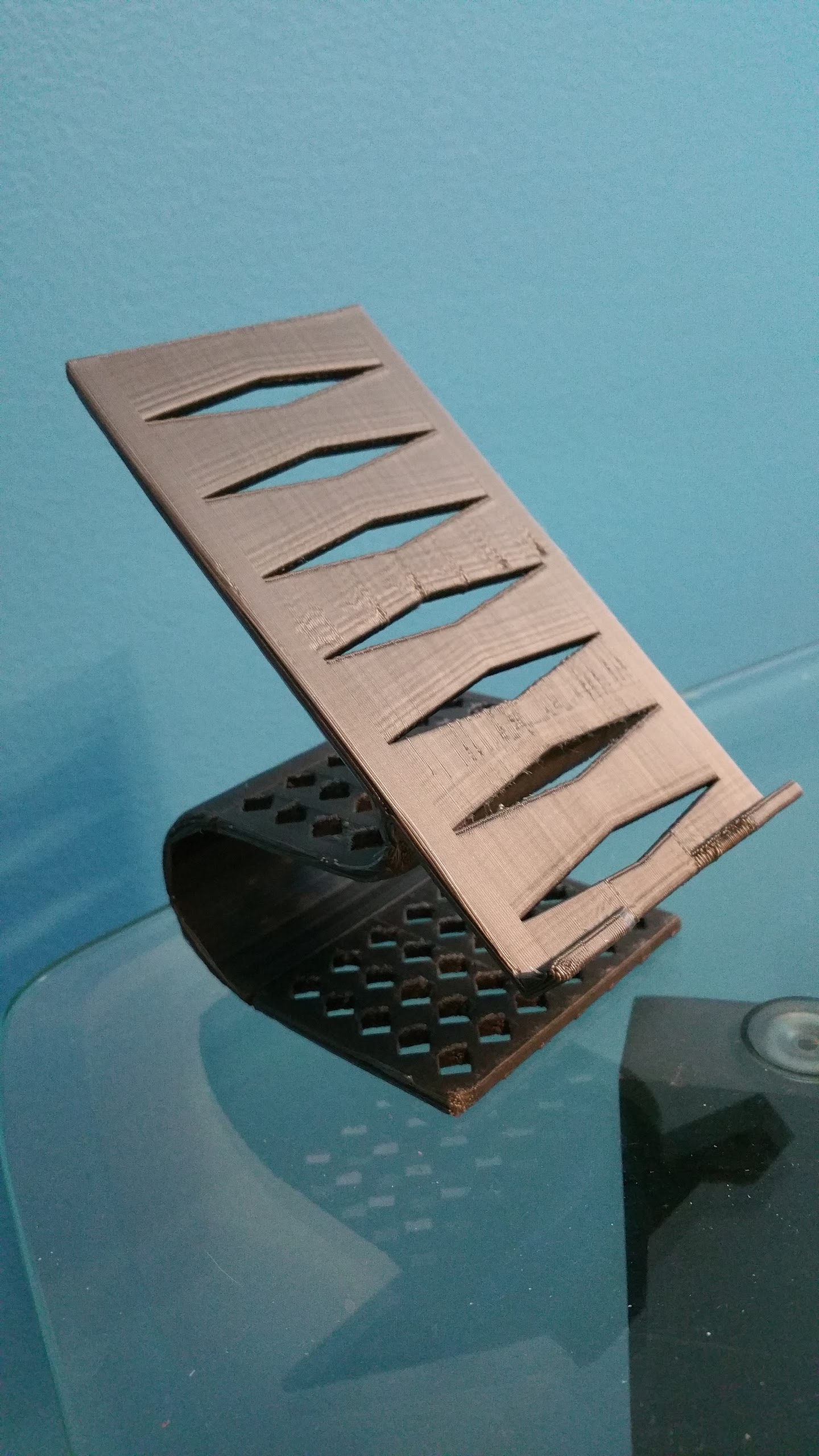 Are you not concerned that the semi-circular bend that supports all the weight is (from what I can tell) printed such that the bending stress will cause the layers to delaminate? It may be fine under the static load of the phone sitting on it, but I’ll bet that if you drop the phone from too high onto it, or lean your hand a little too much while operating, that U bend will fail. If it does, try printing it so that the diamonds are in the Z axis, I expect that would help.