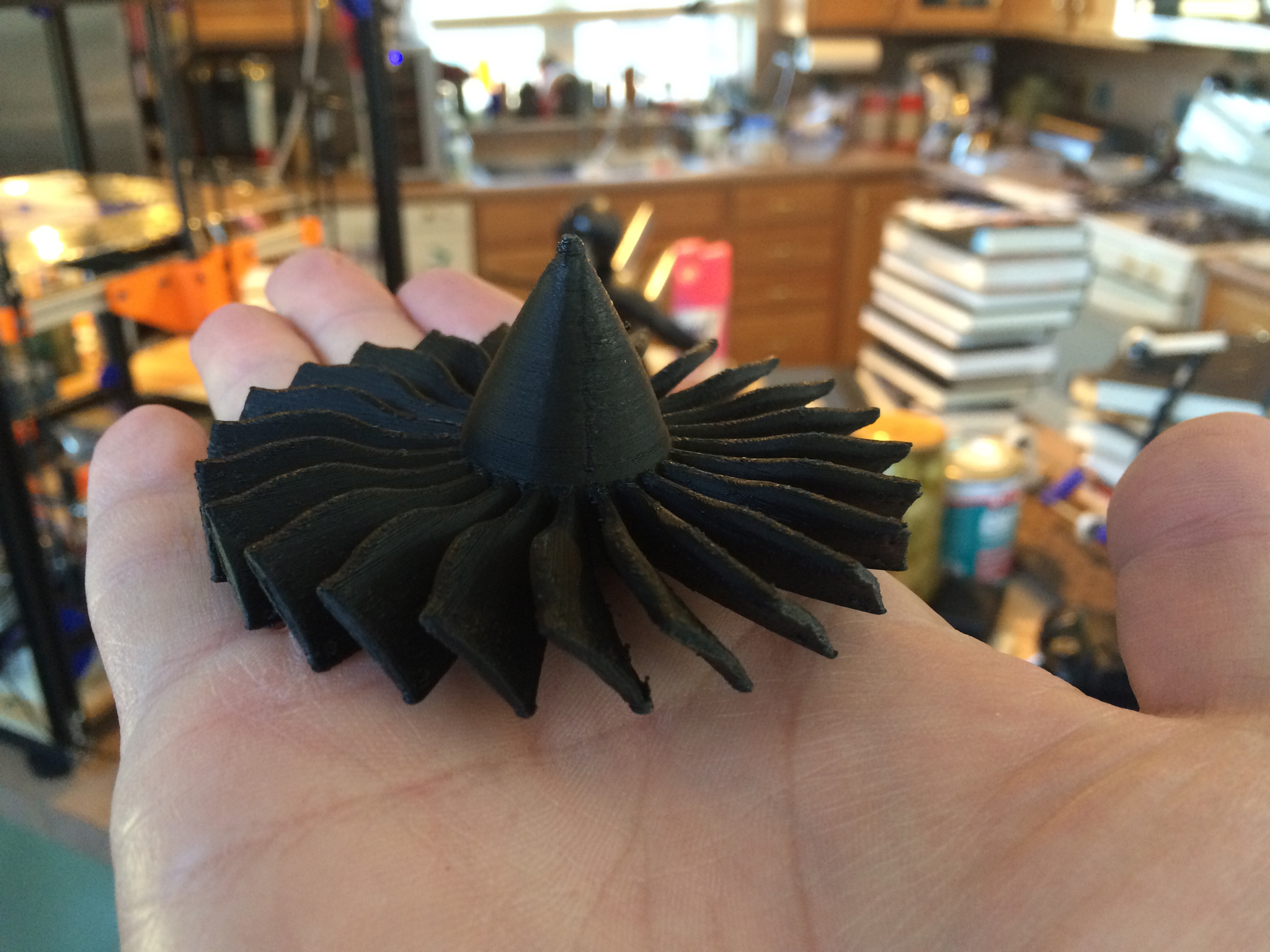 This one was sliced in Kisslicer, I believe. The delta tried a good dozen times to print it, and I suspect the issue there was starvation due to drag on the bowden tube. I’m running a good 95% success rate on the new printer where the onld printer’s success rate depended GREATLY on how big the part was at the center of the plate. 20cm x 20cm in the middle? no problem. 75 cm? good luck.